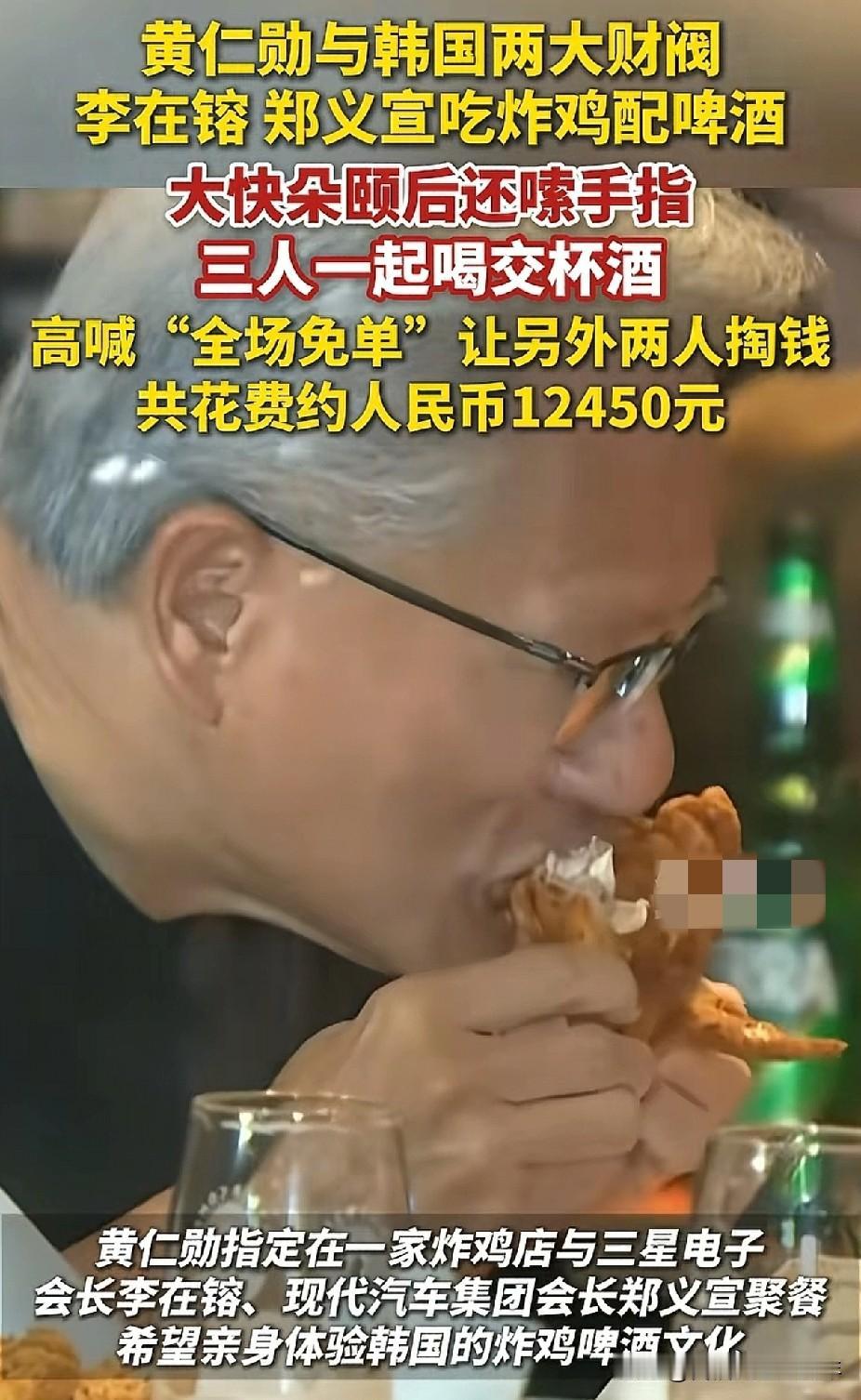 老黄韩国行,炸鸡店高喊“全场免单”,结果掏钱的却是三星和现代的老板!这波操作,秀啊! 当晚,黄仁勋拉着李在镕、郑义宣钻进首尔一家炸鸡店,体验韩国特色的“炸鸡配啤酒”。三份炸鸡、芝士条加生啤,老黄还尝了隔壁桌的烧酒,气氛到位后,他豪气摇铃宣布“全场我请”! 然而,账单最终递到了两位韩国财阀手里,总计约250万韩元(人民币1.2万多)。网友笑评:社交悍匪的最高境界,就是请客让别人付钱😄。 这顿炸鸡不仅吃出了友谊,还吃出了“炸鸡概念股”暴涨——相关公司股价应声起飞,老黄这“带货”能力我服了! 朋友们,你们怎么看?欢迎评论哦😲 黄仕勋 韩国公司餐 金社长韩餐料理 黄恩锡 大表哥韩国逛店 韩国人老板 黄在森