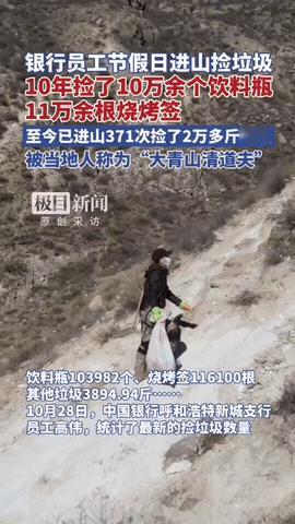 内蒙古有一银行员工,他利用节假日进山捡垃圾,整整坚持了10年,累计进山371次。 他叫高伟,每次进山没有固定的时间,也没有规划路线,不过他却给自己定了一个小目标:每年要么捡1万个塑料瓶,或者捡1万根烧烤签等。 在这10年期间,他总共捡了2万多斤垃圾。更令人感动的是,他将卖废品的钱全部捐了出去。 他拾起了各种生活垃圾,为保护大山环境做出了贡献。在我看来,这才是真正的善举,没有宣传没有博流量,他只是纯粹地做好事! 义务捡垃圾一次两次不难,但十年如一日的坚持,一般人真的很难做到。高伟的这份善举,真的令人非常敬佩!