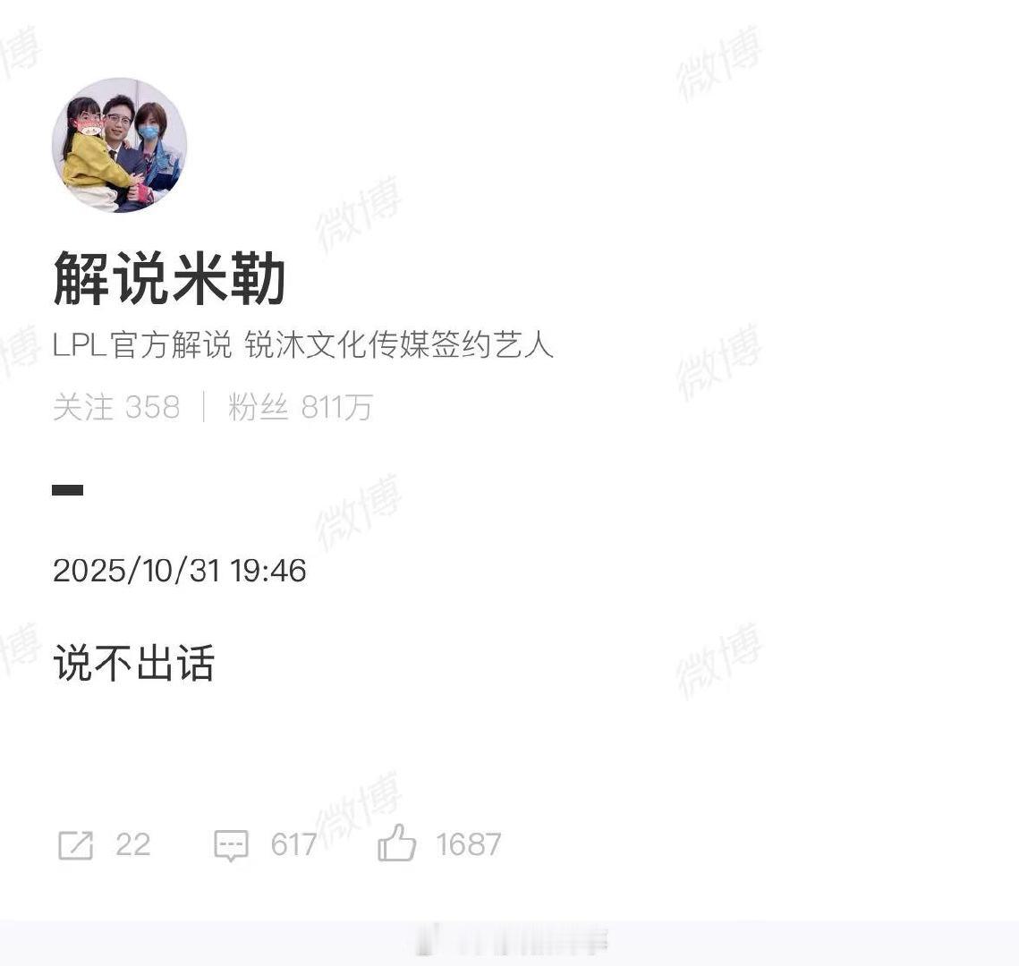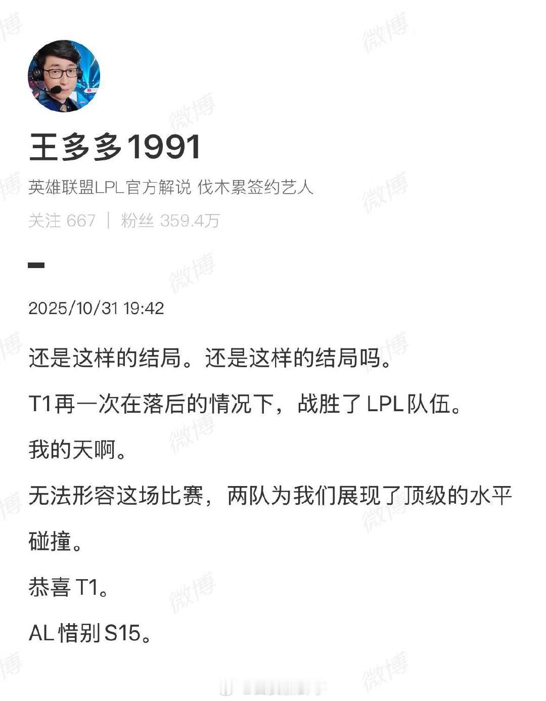 【解说米勒谈T1战胜AL】王多多谈T1战胜AL10月31日,S15八强赛AL 2-3 T1,解说王多多赛后发文:还是这样的结局,还是这样的结局吗。T1再一次在落后的情况下,战胜了LPL队伍。我的天啊,无法形容这场比赛,两队为我们展现了顶级的水平碰撞。” 解说米勒发文:“说不出话。” T1战胜AL