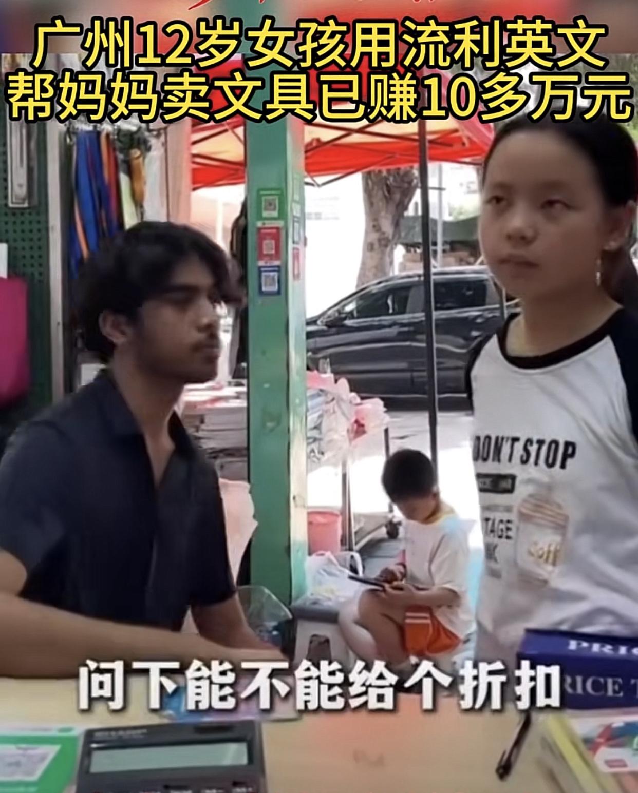不得不承认潮汕人真的很牛掰! 广州黄沙市场旁边一家文具店,一名才12岁的潮汕小女孩在自家的文具档口用熟练的英文口语和外商洽谈生意。而她妈妈在旁边听到外商说的英文根本听不懂,只能干瞪眼,无奈只有求助女儿来当翻译。 而且这名小女孩的生意头脑比英语更加让人佩服,跟外商讨价还价,一单生意下来就是3万。短短几天就做成了10多万的生意,10万对一个文具店来说已经是大单了。 潮汕人的经商基因果然了不起!看看广州深圳的菜巿场就知道,不论大小生意,10个档口,至少有一半是潮汕人在做老板,深圳甚至去到了九成。这是潮汕人的天赋,不服不行,说实话,12岁,我连26个拼音字母都还没捋顺。