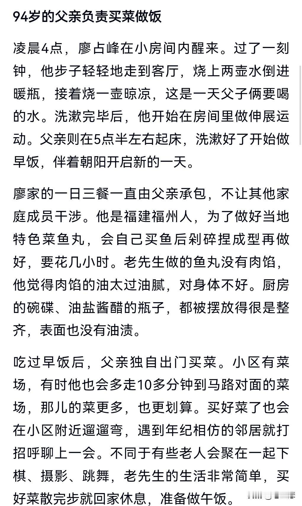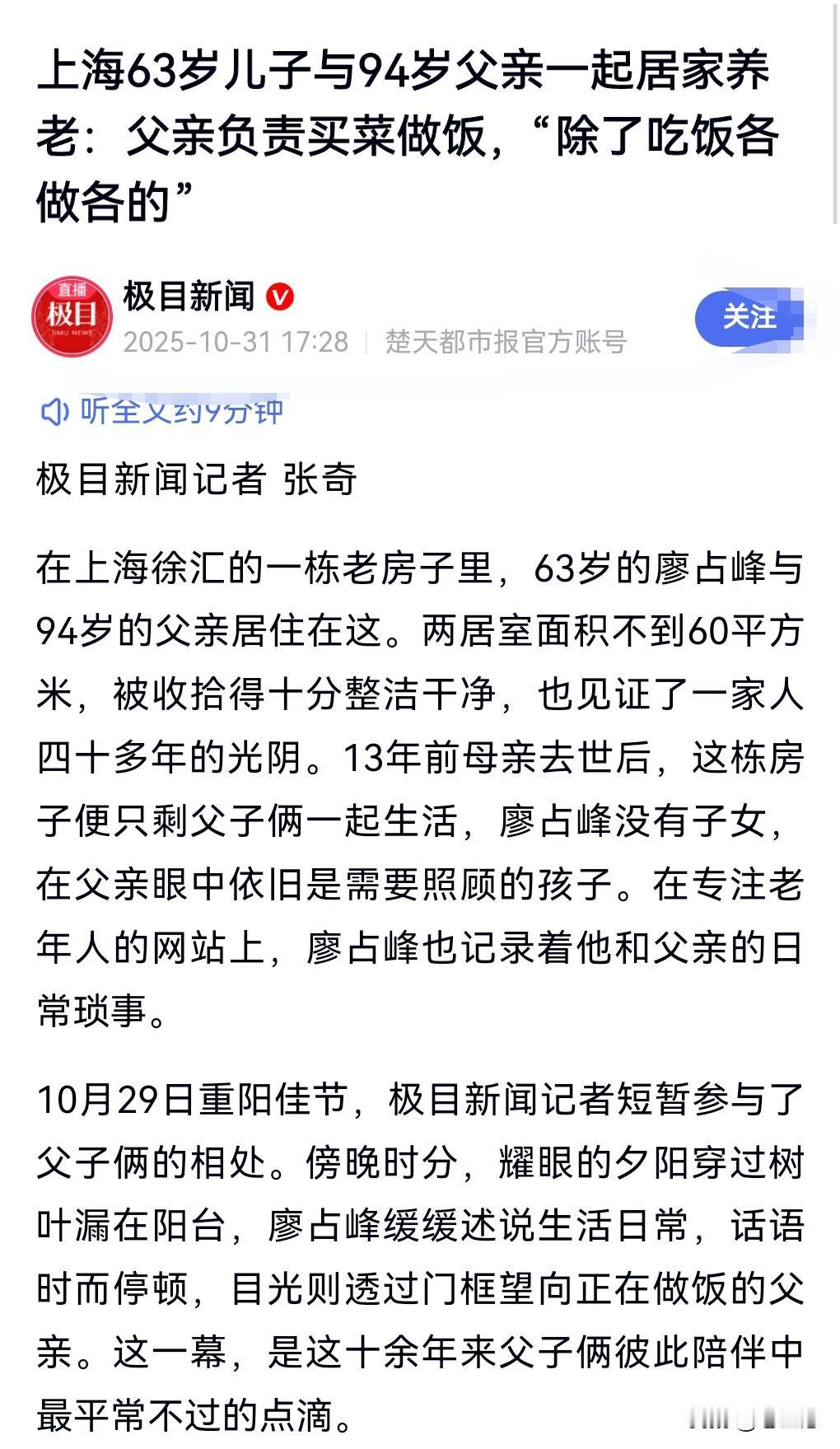如果不是在网上亲眼所见,我是万万不敢相信竟然还有这样的事。 94岁的父亲负责买菜做饭。 感觉不应该是63岁的儿子去买菜做饭吗? 我感觉儿子起码应该主动去把菜买好。 这真的是让我开了眼了,这么大年纪94岁还去买菜。 10月31日看到这么一个消息。 63岁儿子与94岁父亲一起居家养老,除了吃饭,他们各做各的。 每个人都有自己独立的空间,这一点挺好的。
