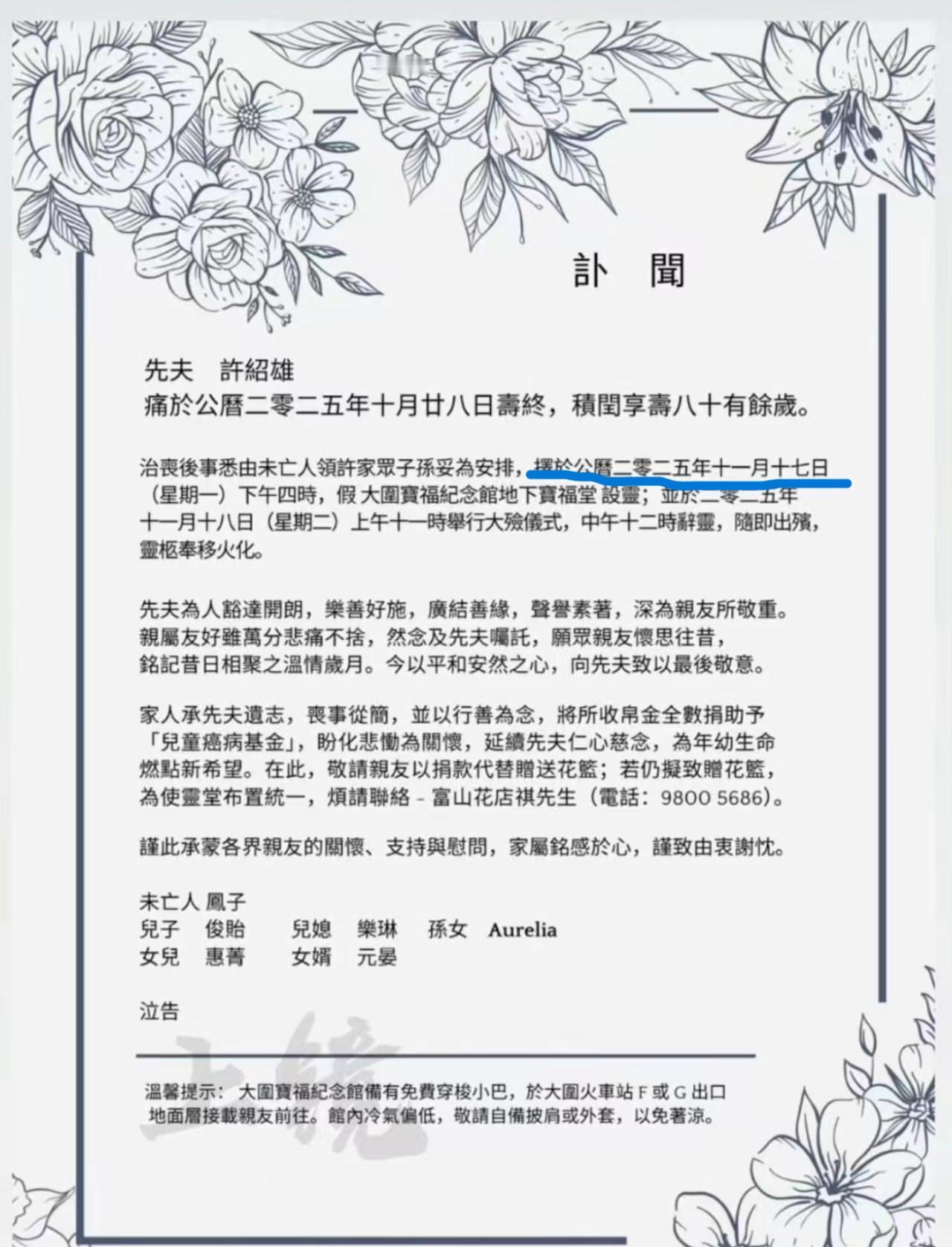 广东香港那边的习俗,是否老人去世要停灵20天?许绍雄是10月28日去世的,但是儿女最新公布的讣告却显示出殡日期是11月17日,算下来正好20天。 印象中农村地区停灵一般是三天,年纪特别大,子孙特别多的会多加一到两天,至于城市里,基本是一到两天就结束了,很少有超过三天的。 难道广东那边的风俗不一样吗?停灵20天是否有点太长了。 不过考虑到许绍雄是名人,有很多人想去悼念他,时间长一点倒也无可厚非,如果是出于这种原因,那倒也不奇怪了。 许绍雄在圈里人缘极好,又是出身名门,更与鲁迅家族结成了姻亲,他的葬礼规模一定很大,儿女们也需要比较长的时间去准备。 鲁迅的孙子周令飞,一直和许绍雄以表兄弟相称,尽管两人血缘关系十分疏远,按照古代礼制,早已出了五服,周令飞却依然在第一时间向许绍雄家人发去唁电。 所以11月17日,周令飞很有可能会亲临现场参加许绍雄的出殡仪式,这也将是他和表哥许绍雄见的最后一面了。