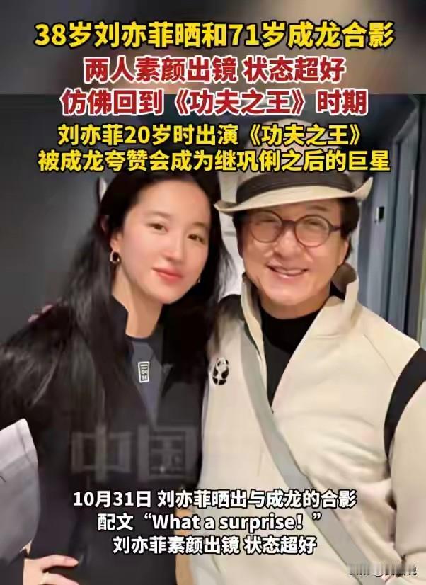 38岁刘亦菲和71岁成龙合照,让人想起两人合作的《功夫之王》,神仙姐姐在成龙旁一