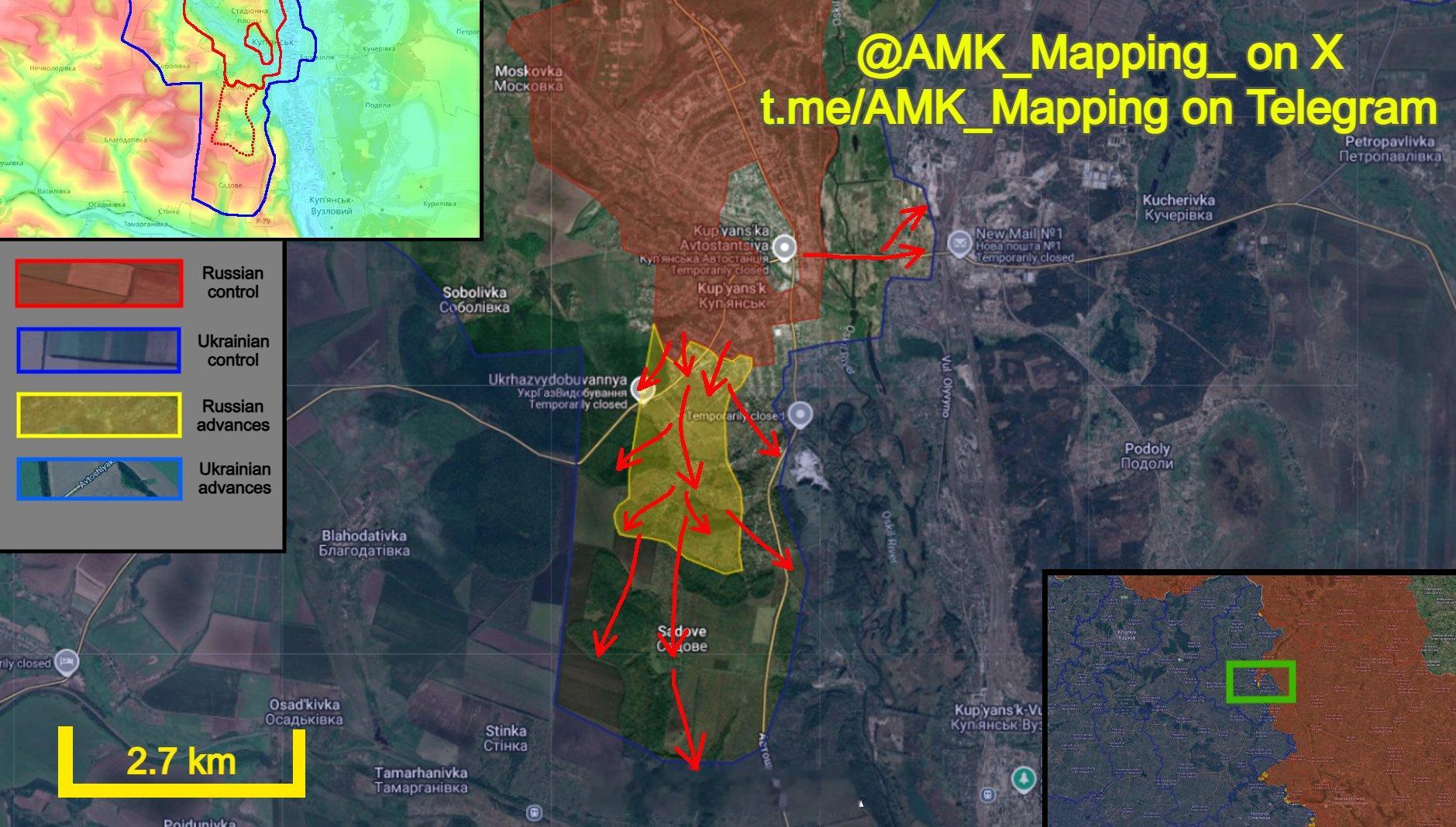 俄军完成了对 “尤维列尼” 高层住宅小区以及东西两侧低层住宅区的占领,并推进至库皮扬斯克最南端的街道。他们成功夺取了这些街道,并迅速向南突破,控制了林区,同时向西南方向推进,进入布拉霍达蒂夫卡方向的森林地带。