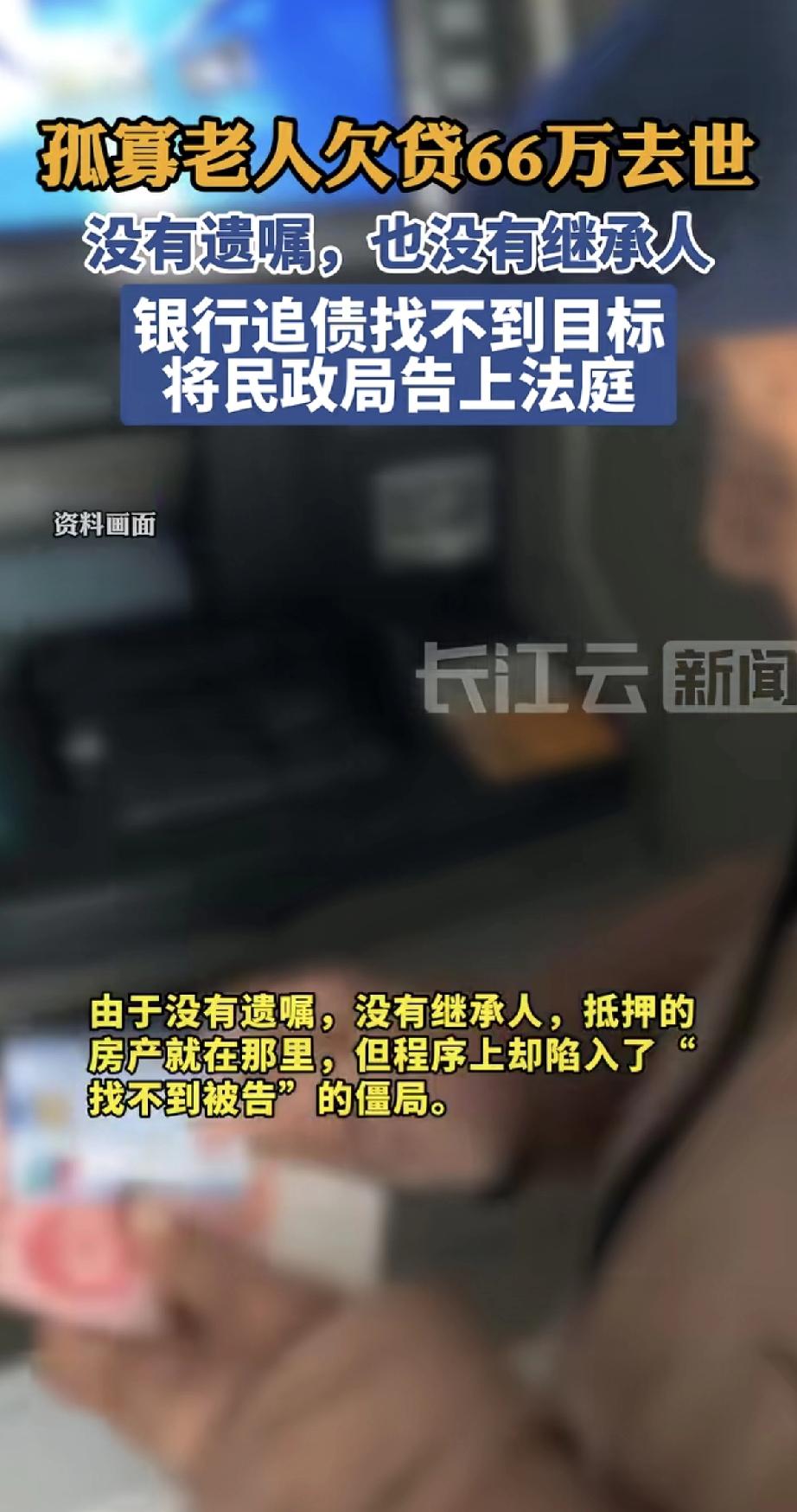 这个老人真正做到了 人在天堂,债在银行!一位孤寡老人去世后,被发现欠了银行66万贷款。因为他既没留遗嘱,也找不到任何继承人,银行追债无门。 无奈之下,银行只好把民政局告上了法庭,希望能由他们来接管并处理债务和抵押的房产。 这类“无人继承的债”,就告了民政局,确实给法律出了道现实难题。