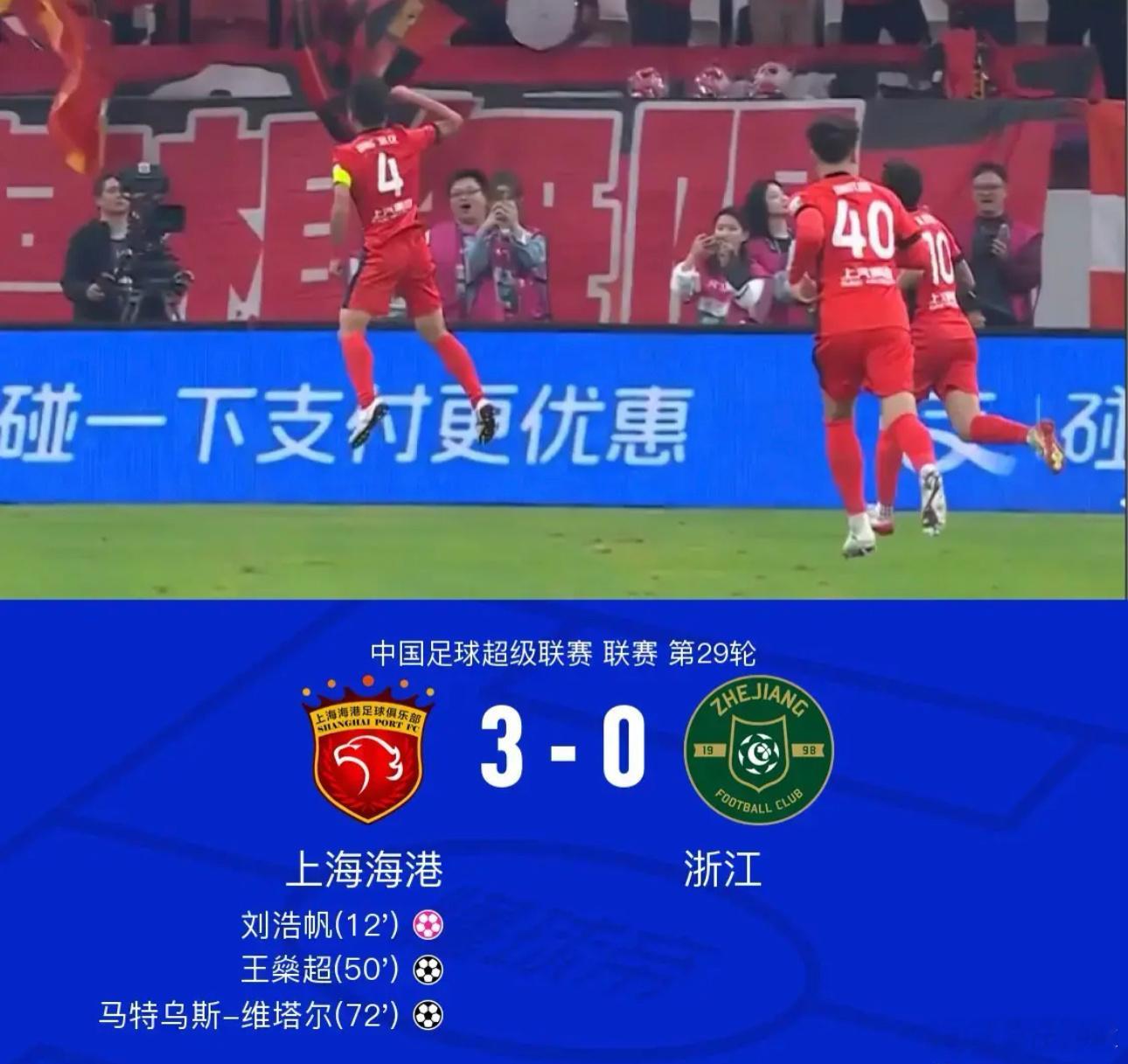北京时间10月31日,中国足球超级联赛第29轮展开角逐,上海海港在主场迎战浙江。比赛中,浙江球员刘浩帆不慎将球打入自家球门。随后,李帅送出助攻,王燊超后点凌空斩再下一城,帮助球队扩大领先优势。比赛进入尾段,维塔尔任意球破门锁定胜局。最终,上海海港以3比0战胜浙江。海港下轮客场击败大连英博即可锁定中超冠军,若稍后成都蓉城主场输给河南队(如果打平差3分,蓉城有交锋战绩优势),且申花主场不胜新鹏城,海港将提前1轮夺冠。足球中超中超联赛上海海港vs浙江队