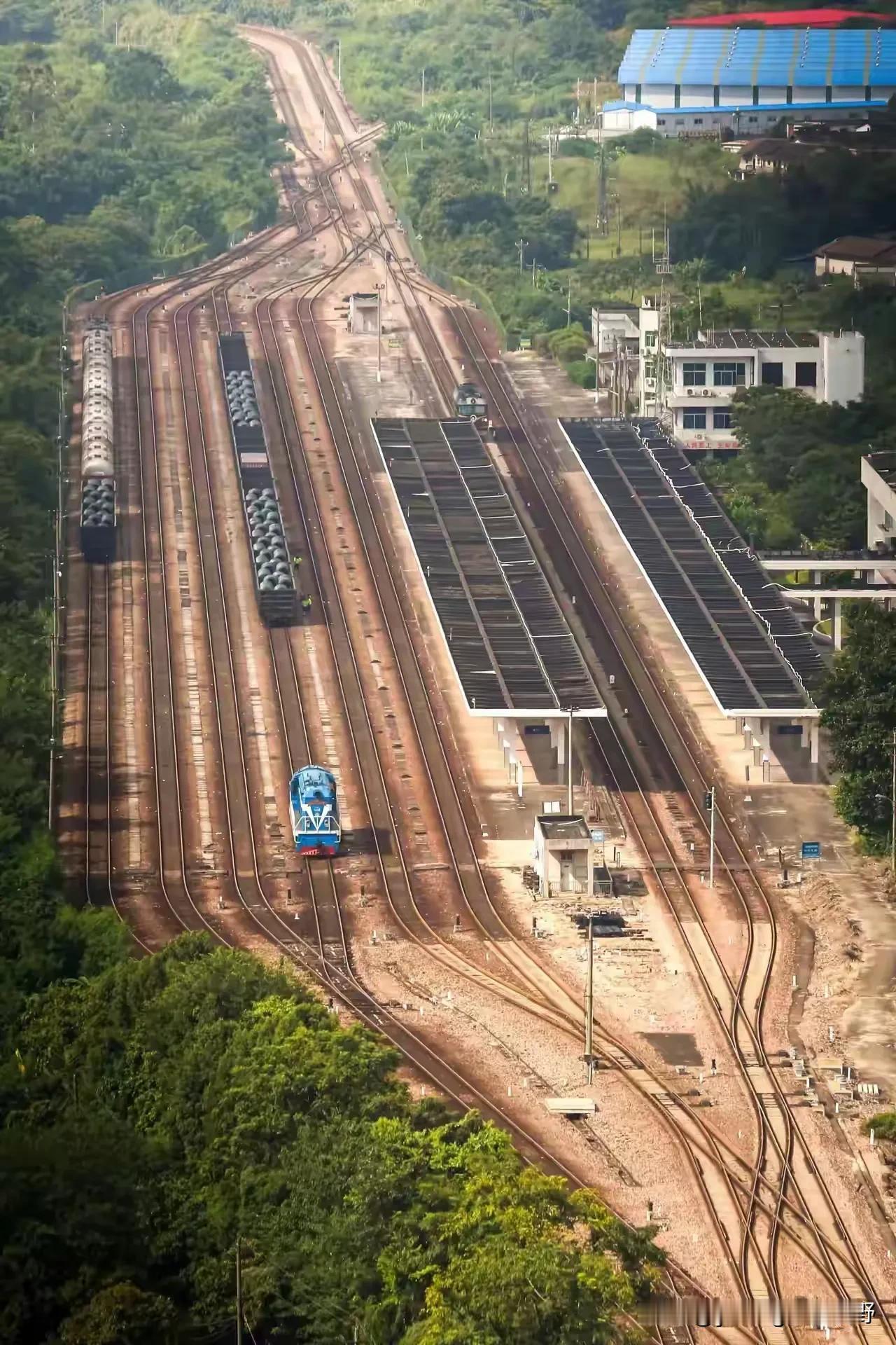 空中航拍视角下的广梅汕铁路梅州火车站。在高铁通车之前,梅州就这么一条单线非电气化的广梅山铁路,每天经停梅州车站的普速客运列车数量也寥寥无几。随着梅州西站以及高铁线路的开通,让这座车站更加没什么客运业务了,货车成为了这座车站的主角。从空中看下来,梅州站的规模也并不大,两座站台,一条正线,两根客车到发线,旁边6条货车停车线路。几乎保留了上个世纪90年代的风格。没有密密麻麻的电气化接触网,整个车站看着还是挺干净清爽的。只是没有过多的火车,令这座车站看着显得比较冷清。