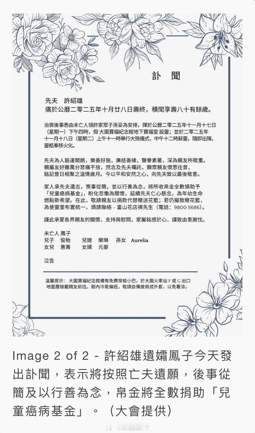 許紹雄周二(28日)因癌症引致器官多重機能衰竭離世,喪禮將於11月17及18日假大圍寶福紀念館舉行。家屬表示按照許紹雄遺願,後事從簡及以行善為念,帛金將全數捐助「兒童癌病基金」。許紹雄遺孀鳳子與家人今天(31日)發出訃聞,全文如下︰