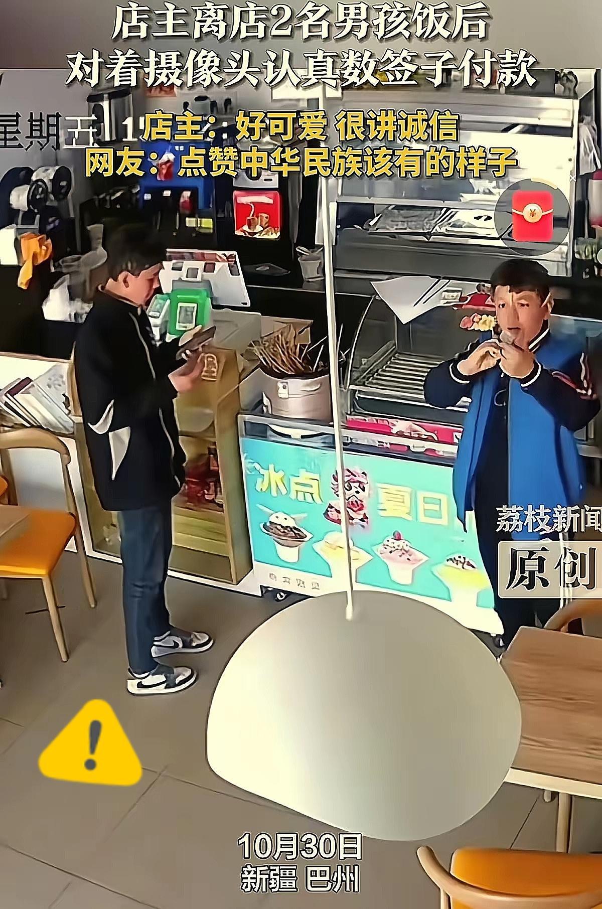 这事不仅新疆人知道了,甚至连整个中国都知道了。 因为摄像头清清楚楚的拍下了你们的模样 新疆巴州的两个男孩,用一个小小的举动温暖了无数人的心。他俩在麻辣烫店用餐时,店主临时外出,两人便对着摄像头认真数清签子、算好价钱,将钱整齐地放在桌上才离开。店主回来后看到这一幕十分感动,分享视频后迅速引发全网点赞。 在无人监督的情况下仍能坚守诚信,这种品质比任何物质都珍贵。这不仅是孩子个人素养的体现,更是家庭教育成功的最好证明,你们的父母、亲人和老师,看到此情此景,也会无比欣慰,无比高兴,因为你俩已经活成了“他们盼望中的模样”!新疆