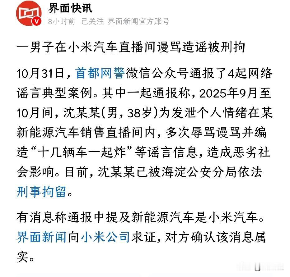 网络不是法外之地!男子在小米汽车直播间谩骂造谣被控告,警方果断出手,该男子被刑事拘留。男子多次在小米汽车直播间发泄个人情绪,造成了极其恶劣的影响最终被网络公安抓获。雷军可不会惯着这些人,买小米大门敞开,批评虚心接受,但是谩骂和造谣绝不惯着,因为祸害了公司声誉,也造成了消费者的误解!这名男子不知会不会后悔,买车可以,千万不要信口开河,特别是造谣抹黑!