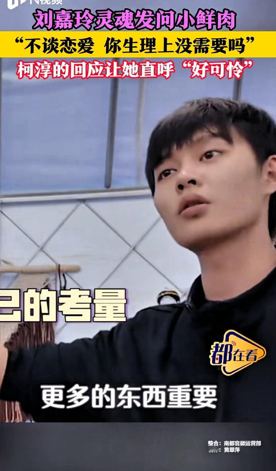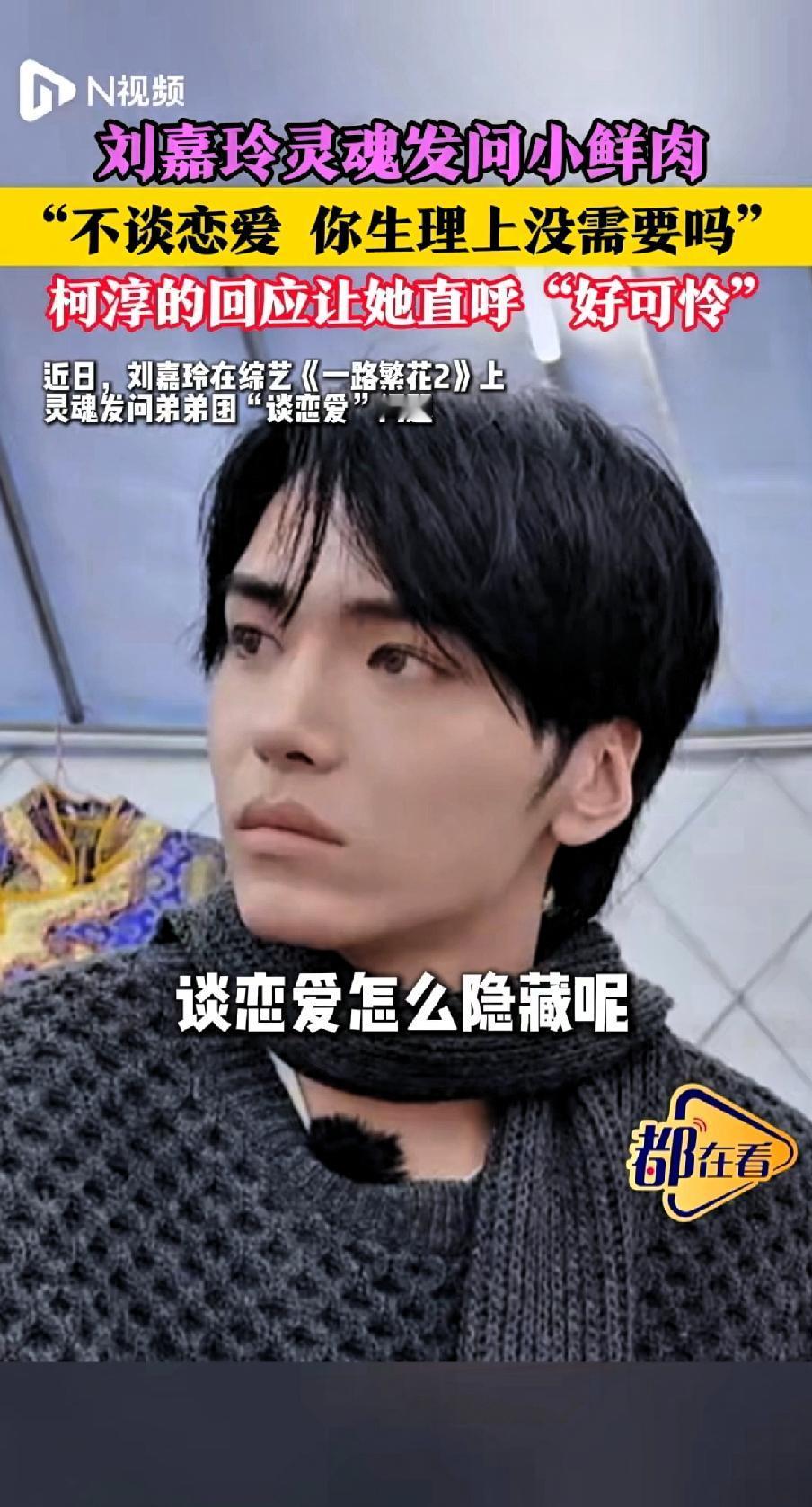 刘嘉玲节目上灵魂发问小鲜肉? “不谈恋爱 你生理上没需求吗”柯纯的回应让她直呼“好可怜”。 《一路繁花 2》这档综艺太有料了!50 + 的刘嘉玲当着镜头追问 25 岁的柯淳“不谈恋爱,生理上没需求吗”,直接把小伙子问得喉结直滚,半天说不出完整话,旁边的宁静还一个劲点头附和。 何赛飞听到刘嘉玲的提问也是睁大眼睛看着小鲜肉如何回答。 这事其实早有铺垫,之前何赛飞“催生”丁克的刘嘉玲,闹得挺不愉快。后来才知道何赛飞儿子跟她姓,估计是觉得刘嘉玲优秀没孩子可惜。 刘嘉玲转头就对柯淳和邵子恒发问,还抛出“你们这年纪结婚都讲条件吧”。刘晓庆也很刚,直接拍桌表示自己的事自己做主。 刘嘉玲这灵魂一问,真把柯淳的偶像包袱戳碎了。 柯淳最后表示心里对恋爱和事业有比重权衡。这综艺真是抓马不断! 刘嘉玲女士在节目上大胆的发问,也是说出粉丝的疑问了? 年纪轻轻正是需求旺盛的时候,小鲜肉为了自己演艺之路是如何解决生理需求的? 普通人谈恋爱无论有几段恋情都不会有人关注,明星又不一样了,身边的所有事情都会被无限放大! 事业上升期的小鲜肉演艺公司也不允许艺人谈恋爱,要保持单身人设。 这也是很多男艺人塌房原因。