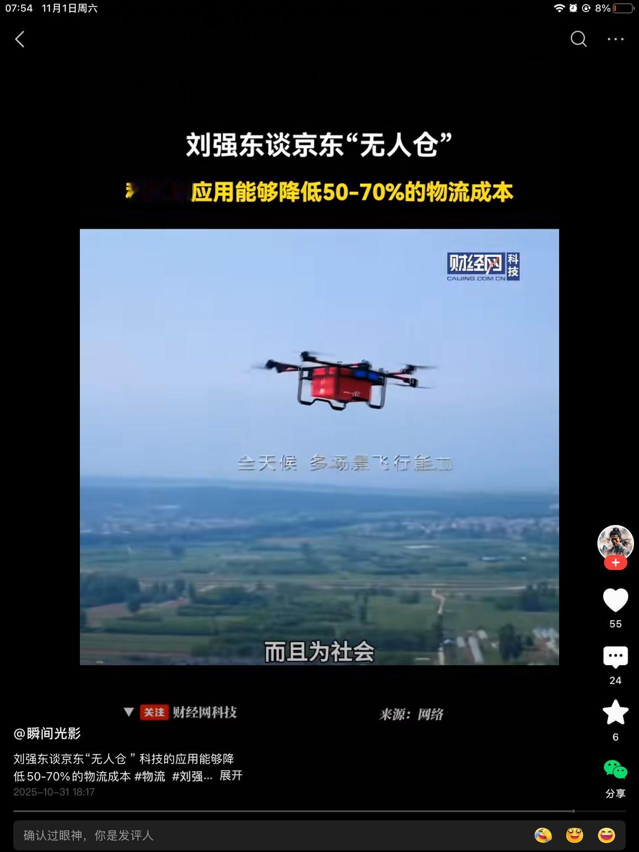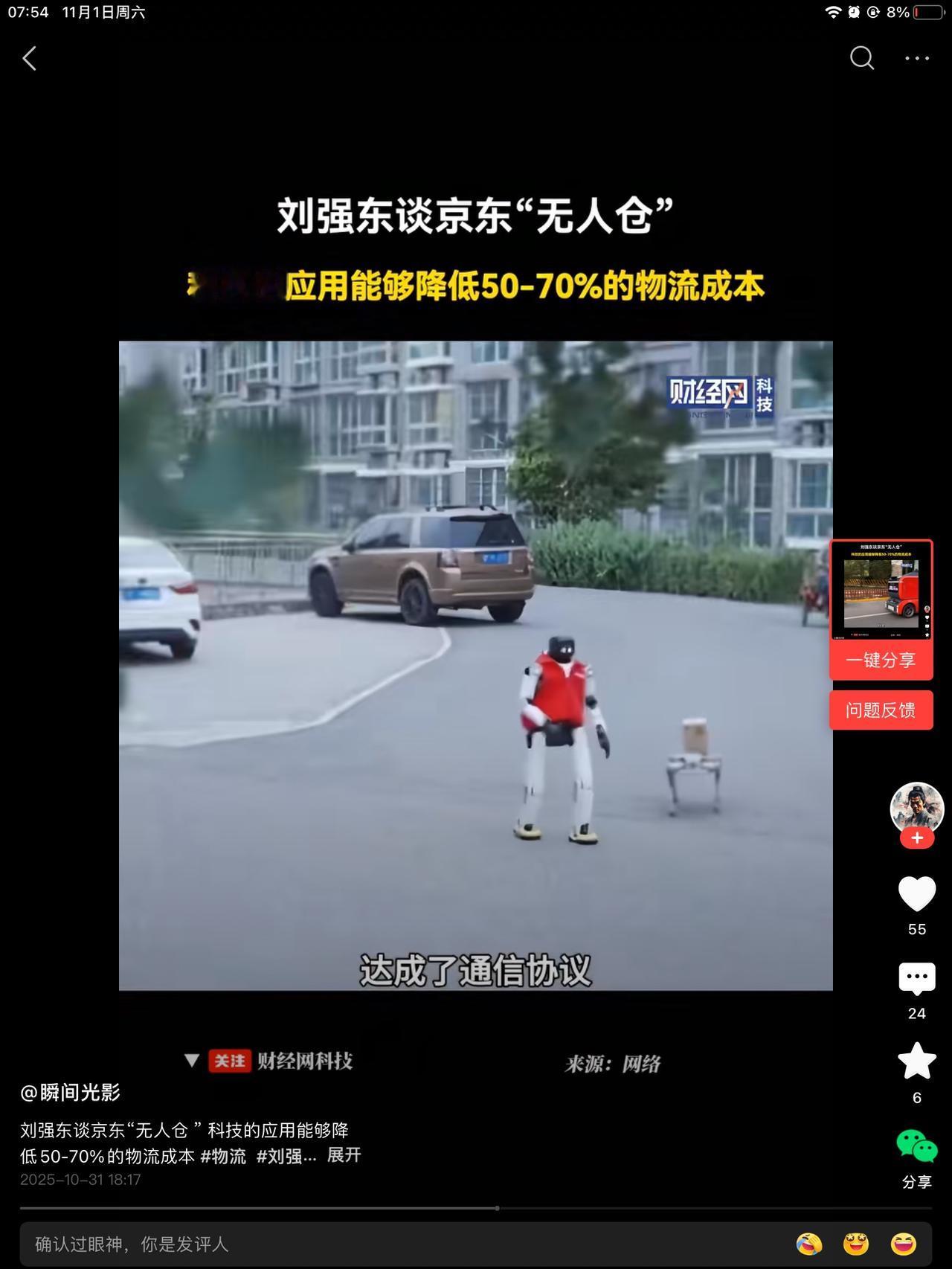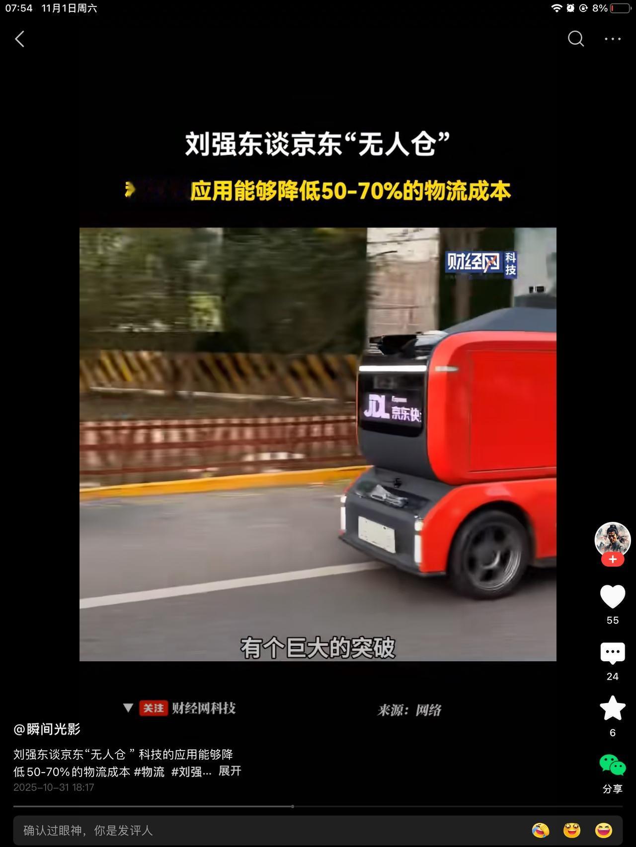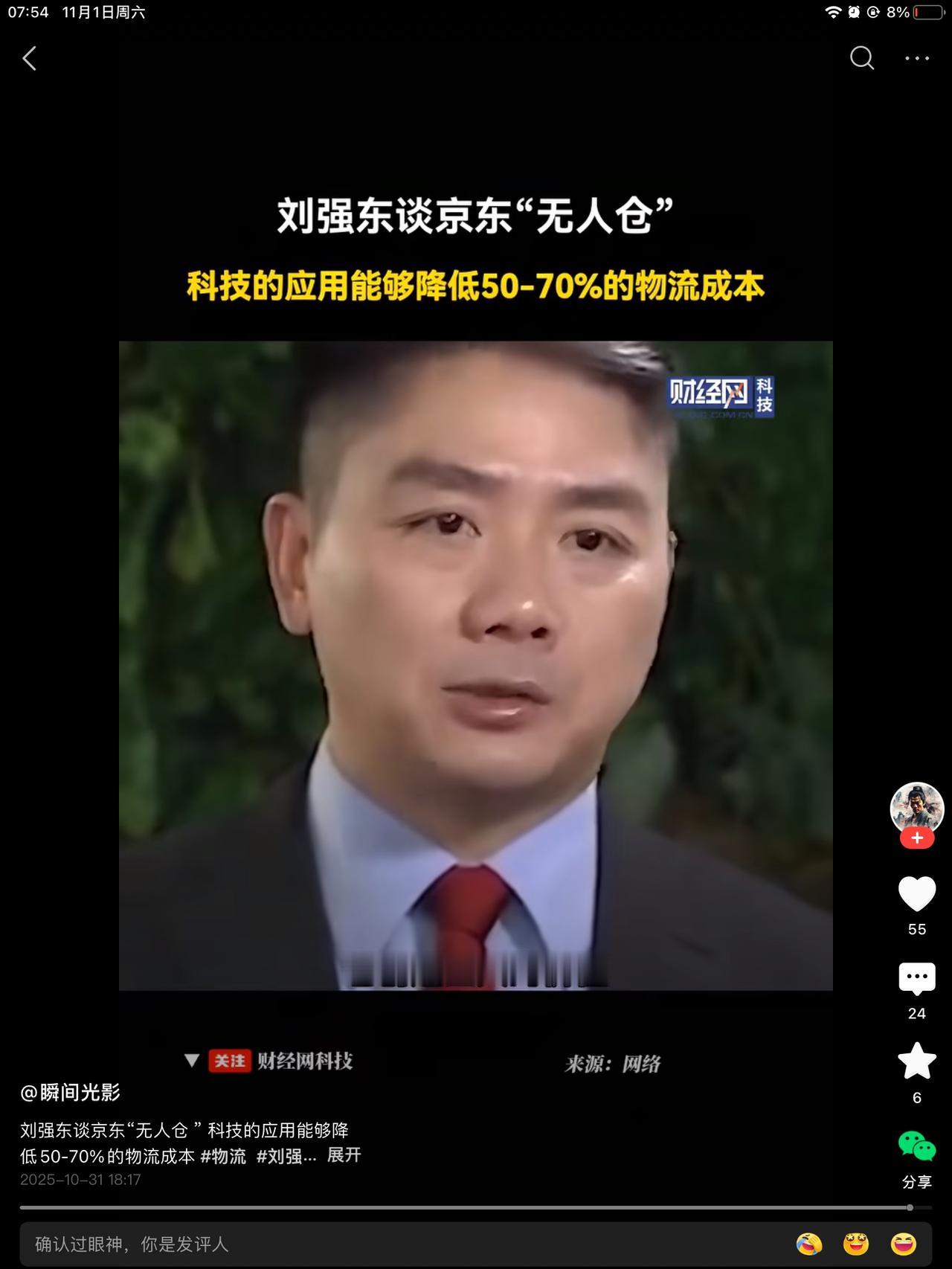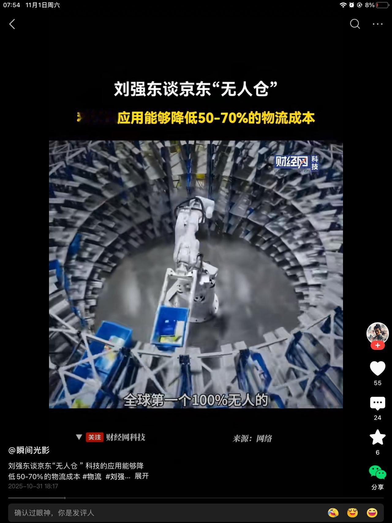 东哥谈无人仓库,能实现百分百仓库无人配送。其实他不仅有无人仓库,还有无人配送车,无人机,机器人配送,现在已经能告诉电梯上几楼了。 这个他说得不明白,是告诉智能电梯吗?还是机器人已经会按电梯的按键了?机器人按键难吗?总之是能省则省。他说了,省五成到七成的成本,说白了,省得是人工。那问题就来了,兄弟们怎么办? 失业是在所难免的,来的这么快真是好伤心。房贷还完了吗?孩子补习班的钱有了吗?别说普通人,就说我,该怎么办? 他说为社会创造了巨大的价值?社会是谁?人都失业了,价值给了谁?当然他没毛病,企业要发展,要节能环保,节省人力开支,这能理解。但靠打工生存的人们,该何去何从?企业家想过吗?京东无人仓