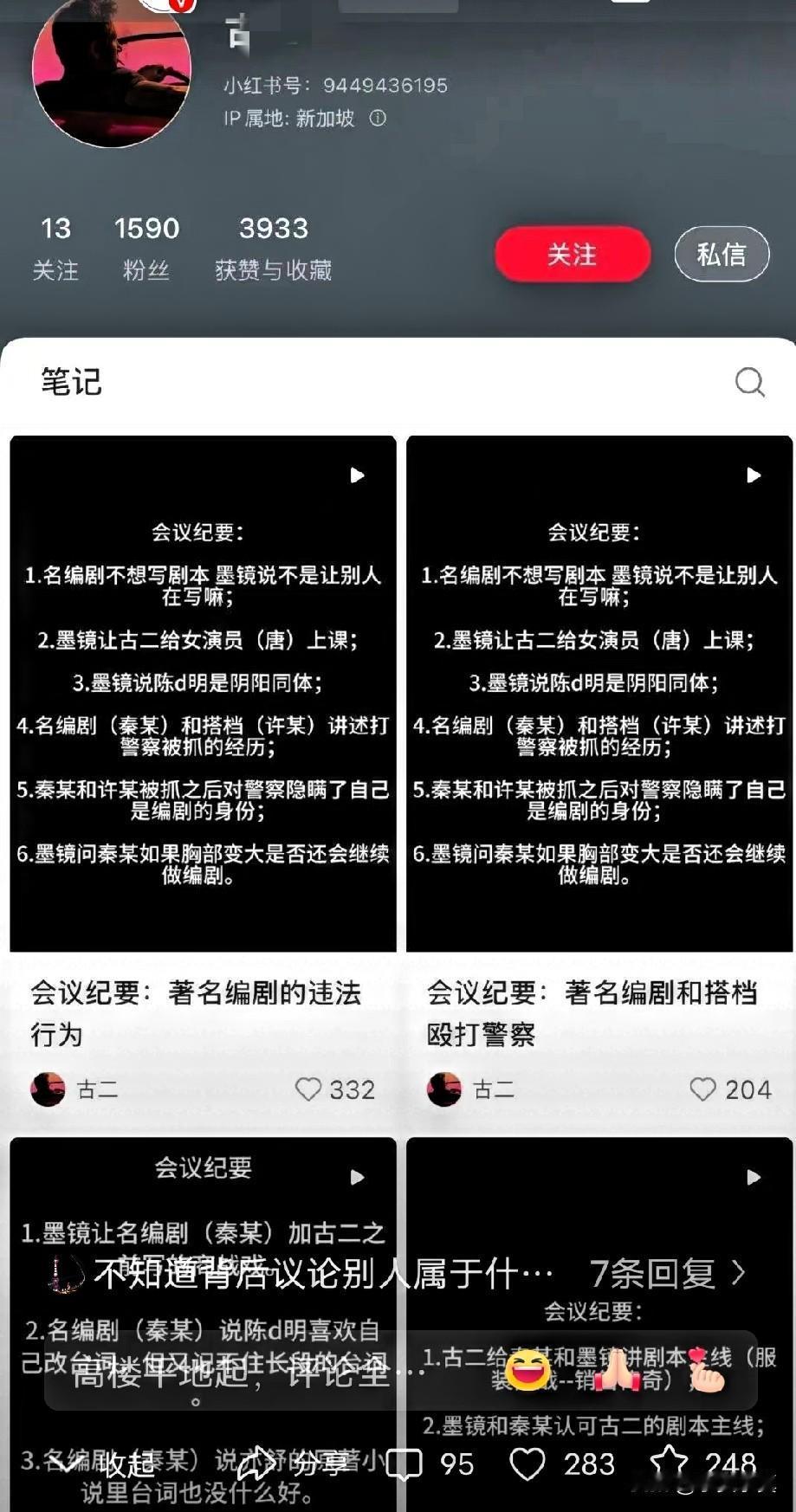 唐嫣,刘诗诗,倪妮受牵连,连老戏骨陈道明老师都没放过 一场横跨月余的录音风波,让《花》这部早已落幕的爆款剧再度深陷舆论漩涡。继9月22日青年编剧“古二”(程某年)曝光编剧秦雯吐槽陈老师爱“掉书袋”的录音后,10月31日,这个已被停用微信账号的编剧选择在小红书重启发声,一口气放出7段总时长超一小时的“会议纪要”录音,将王加卫、秦文等主创的私下对话公之于众,诸多娱乐圈秘辛随之浮出水面。 此次曝光的录音IP地址显示位于新加坡,发布于31日上午8点,内容直指《花》的创作核心与片场幕后。古二在录音中着力佐证自己是《花》大量重头戏份的创作者,而更引人注目的是对话中穿插的明星秘闻。导演王加卫在与古二、秦文沟通唐嫣相关工作时,突然直言“唐艳很装”,并特意叮嘱古二安排外贸领域老师为唐嫣讲解常识时,要让老师先到约定地点,古二需提前“暖场”铺垫人物与故事背景。这一直白评价瞬间引发网友热议,让唐的公众形象遭遇意外冲击。 作为《流某某月》的编剧,秦文在录音中还透露了该剧拍摄期间的演员矛盾。她提到,刘某诗粉丝曾发微博艾特自己与剧方官博,控诉编剧将原著中蒋南孙(刘某诗 饰)的重要台词转给朱锁锁(倪倪饰)。秦雯直言这一投诉背后另有隐情,正在拍摄中的剧集台词本本属保密内容,粉丝不可能知晓细节,大概率是演员团队故意透露,试图通过粉丝施压来干预剧本创作。这一爆料揭开了影视圈常见的“粉丝维权”背后可能存在的艺人博弈,引发业内人士对创作自由与演员干预的讨论。 录音的核心仍围绕《花》的创作,陈老师再度成为焦点。据悉,剧组曾有意邀请陈老师饰演“爷叔”一角,甚至专门让他阅览剧本。但秦文在对话中吐槽,陈老师不仅爱修改台词,还记不住大段台词,这与此前曝光的录音中秦文所说陈老师认为接拍王加卫的戏“太危险了”却又“心里发痒”的矛盾心态形成呼应,让这位老戏骨的职业状态引发争议。此外,王加卫还在录音中评价游老师“不是省油的灯”,虽未详述缘由,但这一模糊评价也让网友对两位资深艺人之间可能存在的分歧充满猜测。 值得注意的是,这些录音的录制时间恰好与《流某某月》拍摄同期,因此对话中既有《花》剧本的深度探讨,也夹杂着片场闲聊与明星评价,私密感极强。就在媒体整理录音内容、网友热议不断升级时,古二的小红书账号突然屏蔽了部分视频,让这场爆料增添了更多悬念。 回顾这场风波,《繁花》剧组早在9月23日就曾发布声明,谴责古二偷录私人对话并加工发布的行为,称其“严重侵害他人隐私,毫无职业道德”。但古二并未止步,此次再度曝光更长录音,似乎意在进一步佐证自己的创作贡献,同时揭开更多幕后真相。 一边是编剧控诉创作成果未被认可,一边是剧组指责偷录侵犯隐私,这场持续发酵的舆论战让影视圈的创作生态与人际关系暴露在公众视野中。录音中的明星评价、演员矛盾、创作分歧,不仅让相关艺人陷入舆论争议,也引发了公众对影视行业职业道德、隐私边界与创作公平的深度思考。随着部分录音被屏蔽,事件后续是否会有新的反转?古二能否拿出更直接的创作证明?《花》幕后的真相究竟如何,仍有待时间给出答案。而这场风波也为影视行业敲响警钟,如何平衡创作争议的解决与隐私保护的边界,成为亟待探讨的行业课题。 免责声明:语录和图片素材来源网络公开渠道,如有侵权,请及时告知,联系删除。