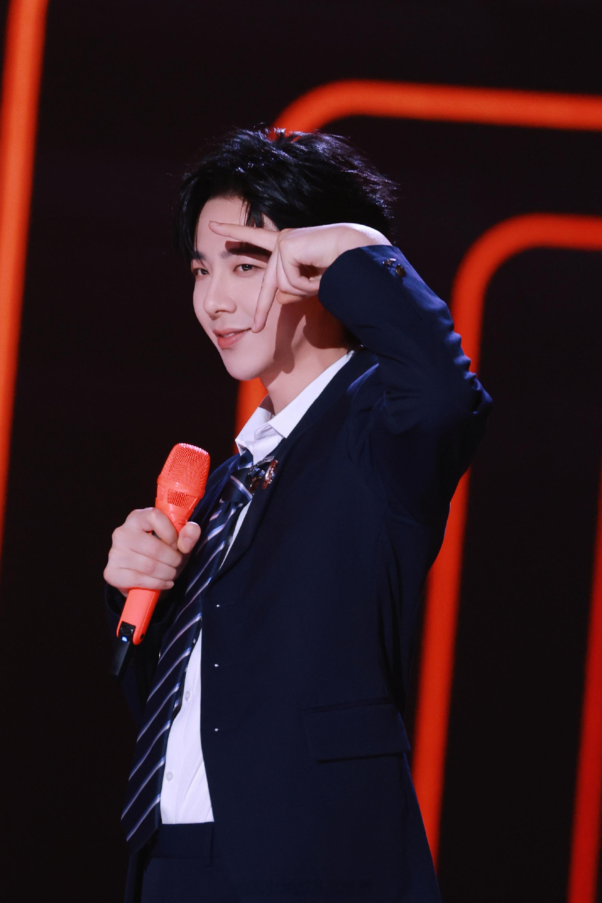 深蓝色西装搭配条纹领带,校徽点缀细节,刘宇宁手持橙色麦克风,在舞台灯光下,眼眸里的光温柔而坚定,仿佛藏着星辰大海。既是Seven Kids的艺统担当,也是用心的音乐匠人。