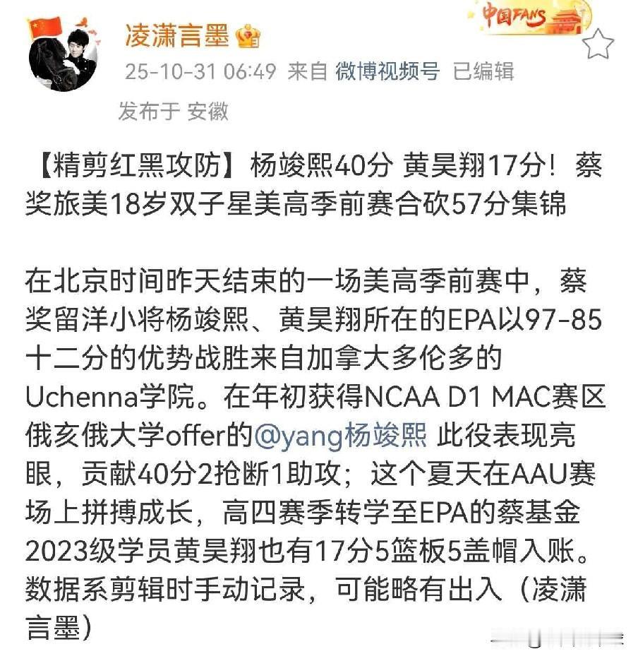 广东天才杨俊熙爆砍40分闪耀美国高中赛场 近日据媒体报道,蔡崇信基金旅美新星杨俊熙,两人在近日美国高中联赛季前赛中打出了高光表现,全场砍下40分2抢断1助攻,带领球队以97-85战胜了对手,要知道这可是完胜中国青年联赛的美国高中联赛,杨俊熙单场砍下40+,确实很出色。 杨俊熙是2023年蔡崇信篮球基金送去美国留学的,今年18岁,身高1.95,司职得分后卫,上赛季在高中联赛场均20.5分4.8篮板,三分球命中率38%,这个表现确实非常不错,原来他是和郇斯楠一批去的美国,大家都在关注郇斯楠了,杨俊熙其实表现也很不错,据悉他已经获得了多支NCAA一级联盟球队的邀请。