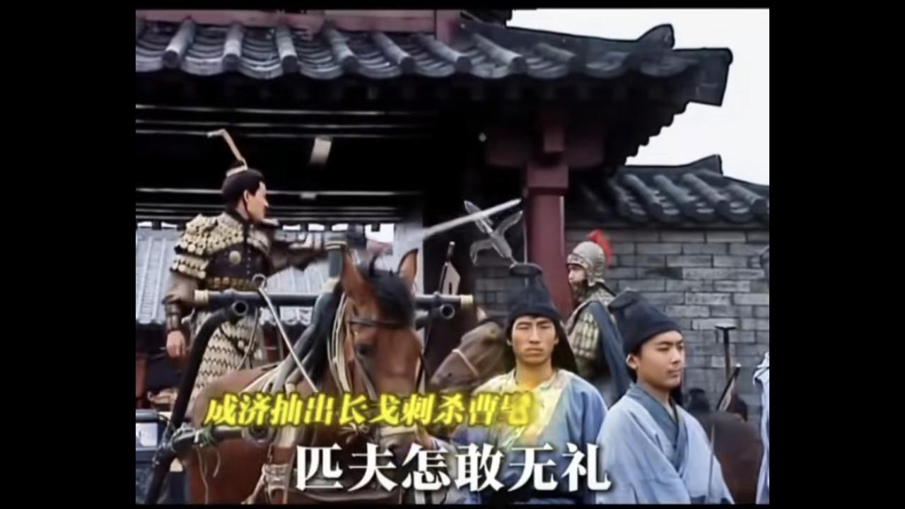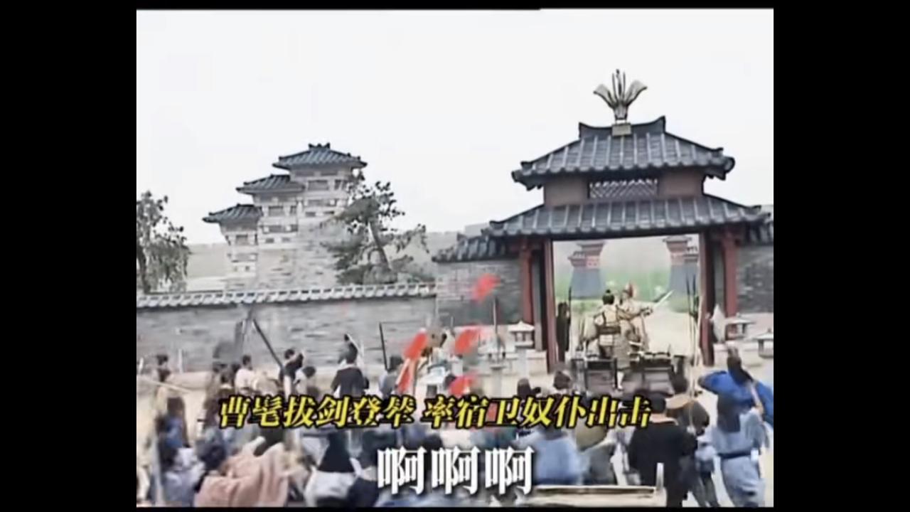 三国:司马昭之心 路人皆知! 曹髦:“朕决心已下,卿等助我前往讨贼!啊啊啊……,朕乃大魏天子,尔等闯进宫来,莫非要造反不成?” 贾充:“成济,司马公养你何用?正为今日之事,要死的还是要活的,司马公有令,要死的。” 曹髦:“匹夫怎敢无礼?!” 贾充:“成济,汝还等什么?” 成济:“杀,啊……。” 成济抽出长戈,当街刺杀大魏天子曹髦。 司马昭近臣:“只有如此,只有处死贾充,方能谢罪天下!” 司马昭:“可另有他法?” 司马昭近臣:“只有如此,别无他法!” 司马昭:“来人,将成济拿下。” 成济:“主公,成济无罪,成济无罪啊……。” 司马昭:“成济弑君,大逆不道,千刀万剐,诛灭三族。” 成济:“奸贼,是贾充传令,只要死的,我有何罪?奸贼奸贼!” 司马昭:“血口喷人,将他舌头割去。” 成济:“奸贼,是你司马老儿要当皇帝,让我杀人,奸贼奸贼!”