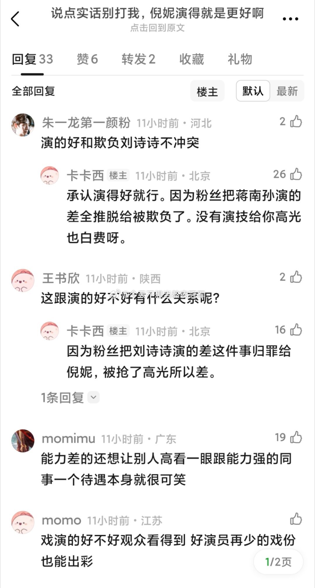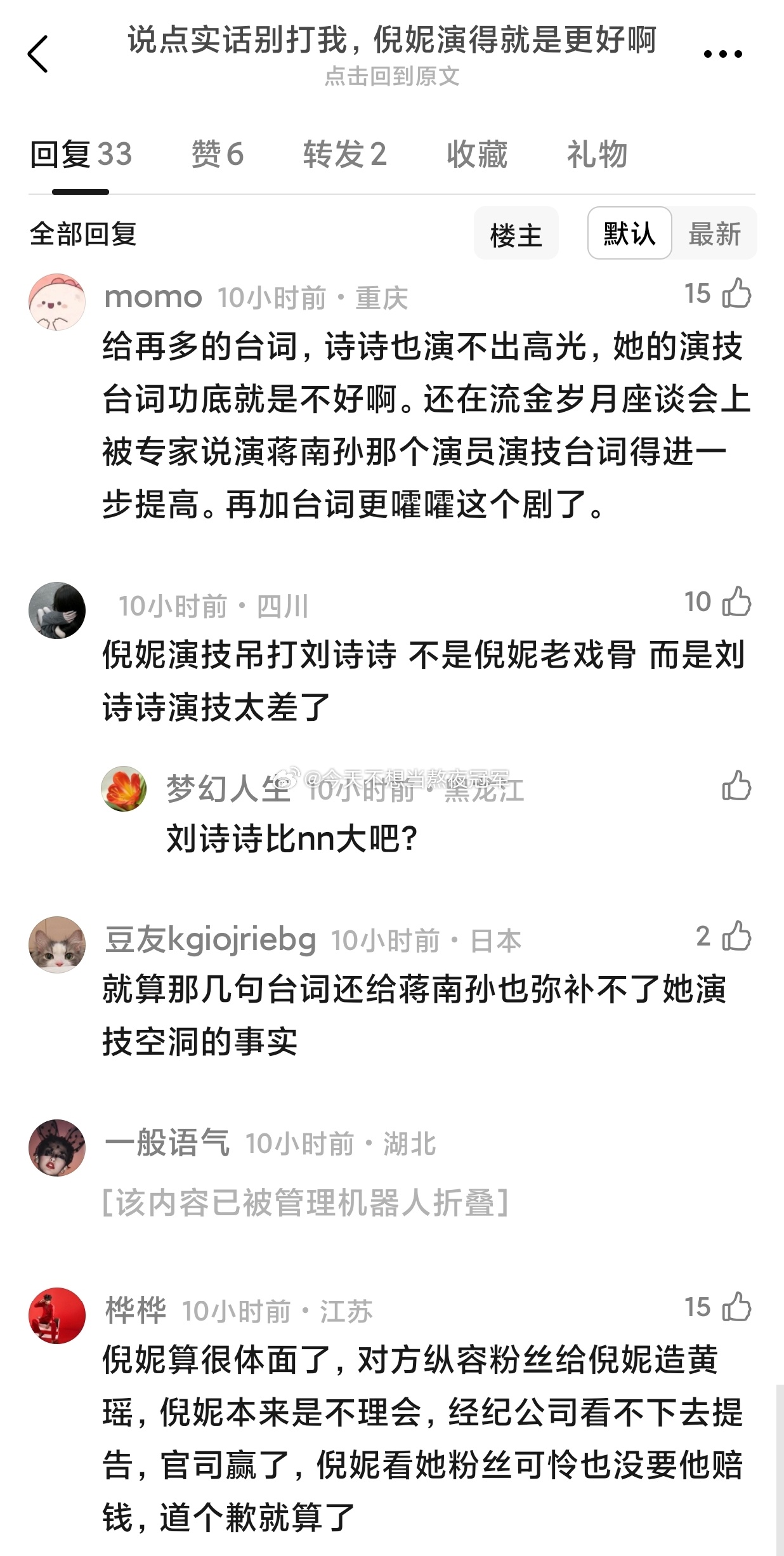 秦雯说自己手底下的小编剧把《流金岁月》里蒋南孙(刘诗诗)的台词写给了朱锁锁(倪妮),编剧肯定是有责任的。可当年一姐被嘲的明明是演技和台词功底,现在粉丝直接认定是因为一姐是被做局了,才被倪妮掀 桌[笑cry]