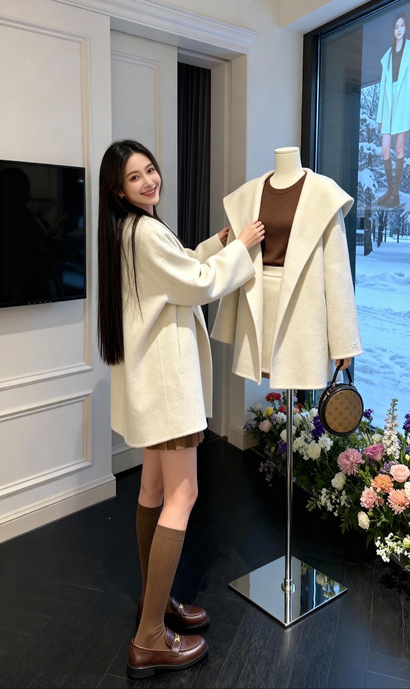 《那件系带白色大衣》艺术馆的灯光下,她站在抽象画前,白色大衣的腰带在身后系成垂落的流苏。连帽设计衬得她更娇小,却因挺括的羊毛呢料而充满力量感。收腰剪裁勾勒出恰到好处的X型轮廓,像画框般聚焦了她整个人的光彩。