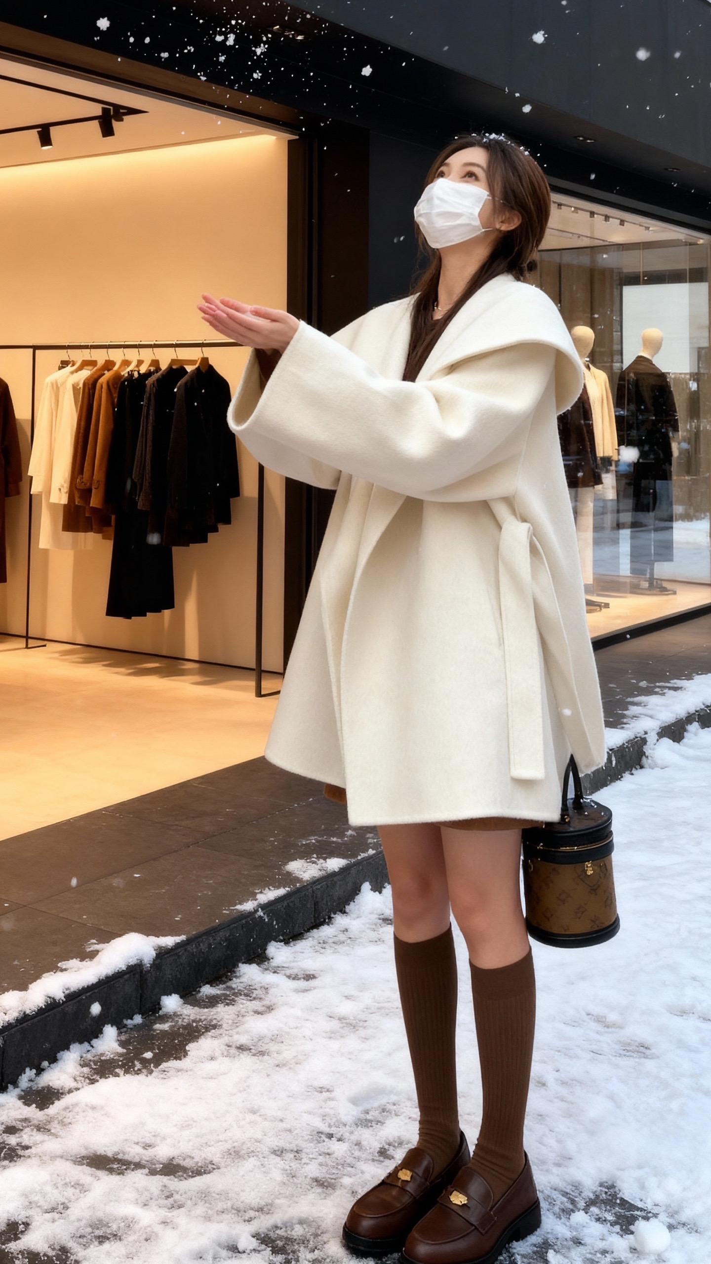 内搭的咖色打底衫与及膝袜呼应,在冷白大衣下绽开温暖层次。棕色皮鞋踏在地面的脚步声清脆,如同她面对生活始终清晰的节奏。