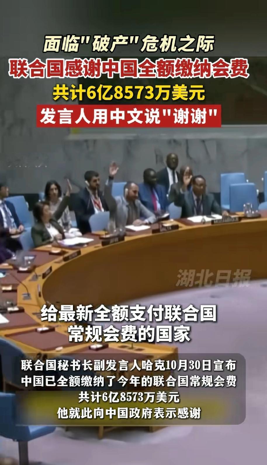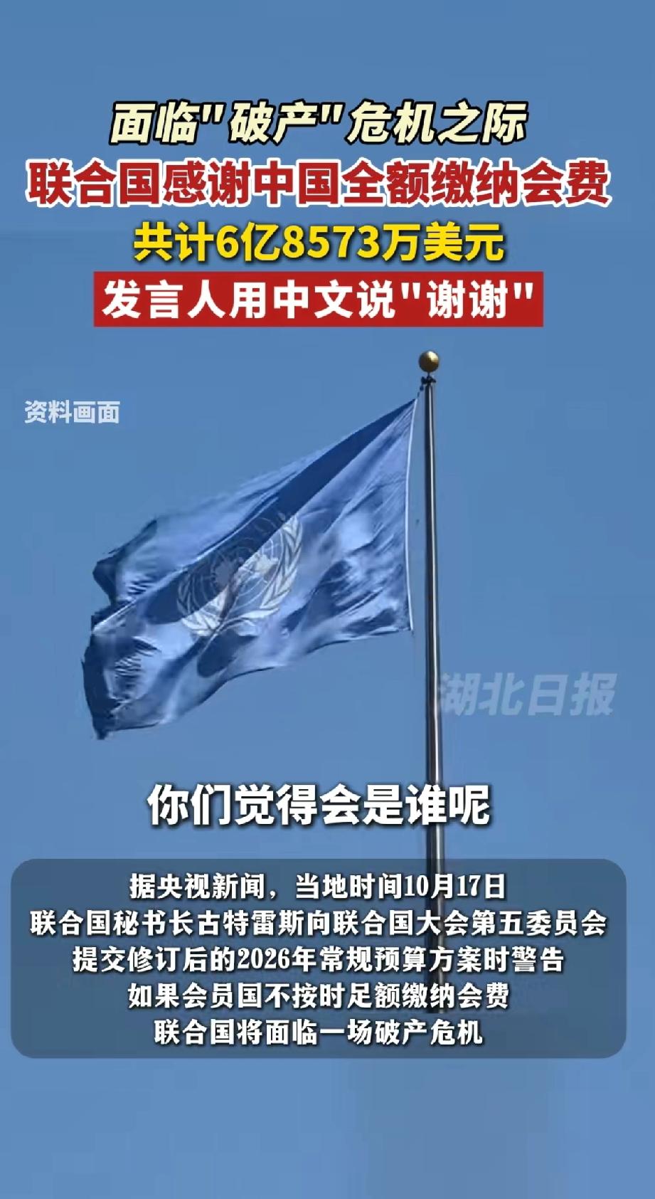 面临“破产”危机之际,联合国发声感谢中国全额缴纳会费。 当地时间10月30日,联合国秘书长副发言人法尔汉·哈克用中文说“谢谢”,感谢中国全额缴纳6亿8573万美元会费。 中国作为联合国第二大会费分摊国,分摊比额达20%。 而此时联合国正面临“破产危机”,秘书长古特雷斯早就警告,若会员国不按时全额缴费,危机就会降临。 美国作为第一大会费分摊国,却拖欠超30亿美元。早在2019年,联合国就遭遇过严重资金危机,今年美国更是几乎停缴。 中国足额缴费尽显大国担当,反观美国,实在是让人摇头。 仔细观察人在说谢谢的时候,嘴角就会不自觉的上扬?哪怕是外国人也是如此!