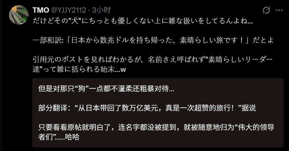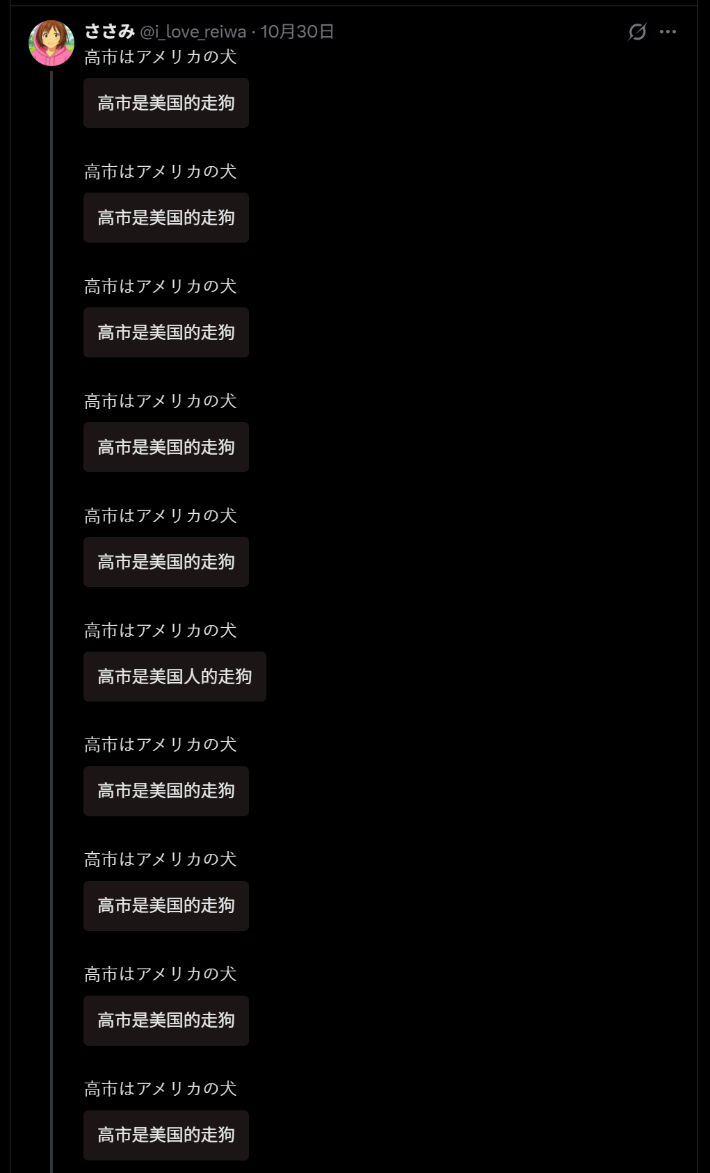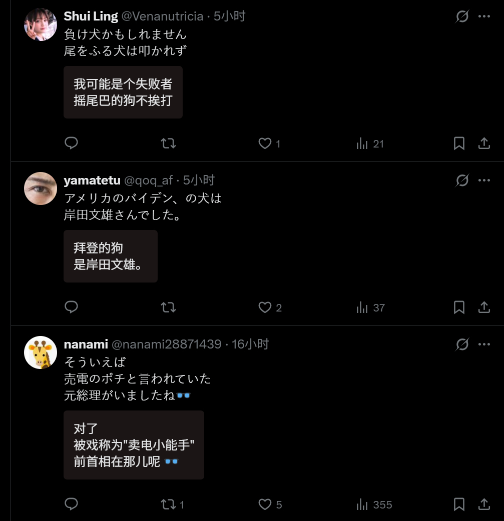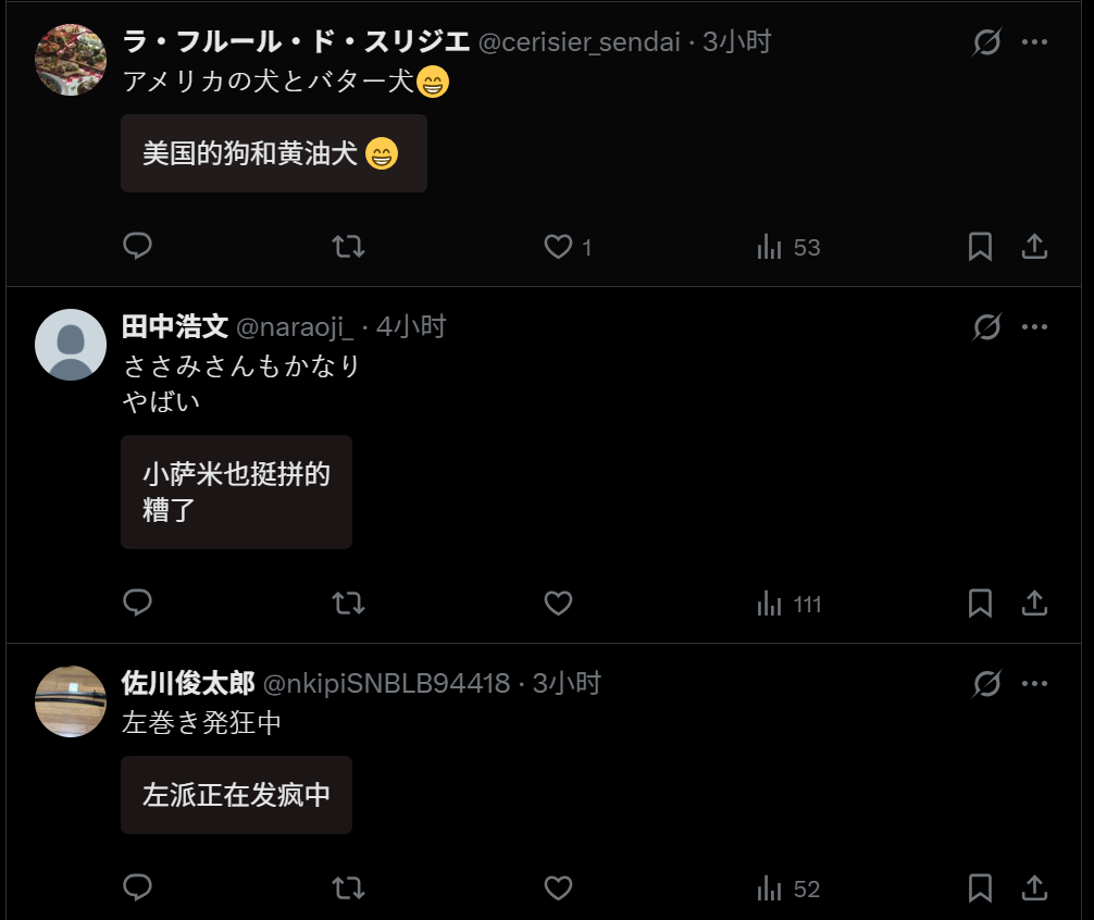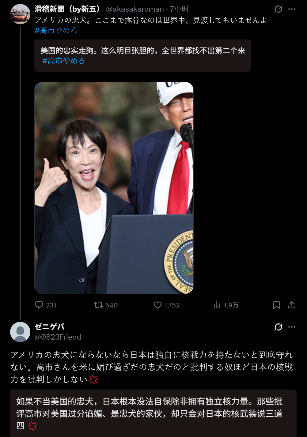 🔻日本网民这几天讨论的议题始终围绕着下面的核心进行:“高市早苗是美国的狗”、“高市不是美国的狗”、“到底谁是谁的狗”、“石破才是狗”、“总比当俄韩的狗好”、“资本家的狗、财务省的狗”、“岸田也是走狗,但你们这帮家伙只指责高市女士,为啥?”、“你们才是狗”、“你是谁的狗”、“我也这么觉得。但作为狗只能认命了”、“我家狗狗超爱吃鸡胸肉干”。