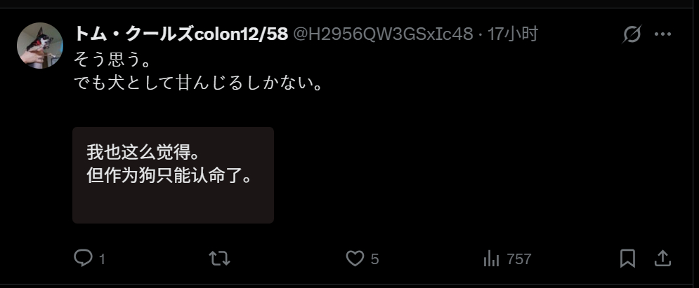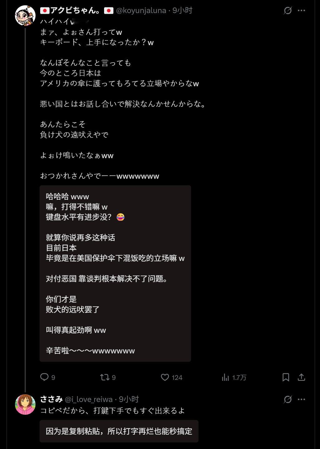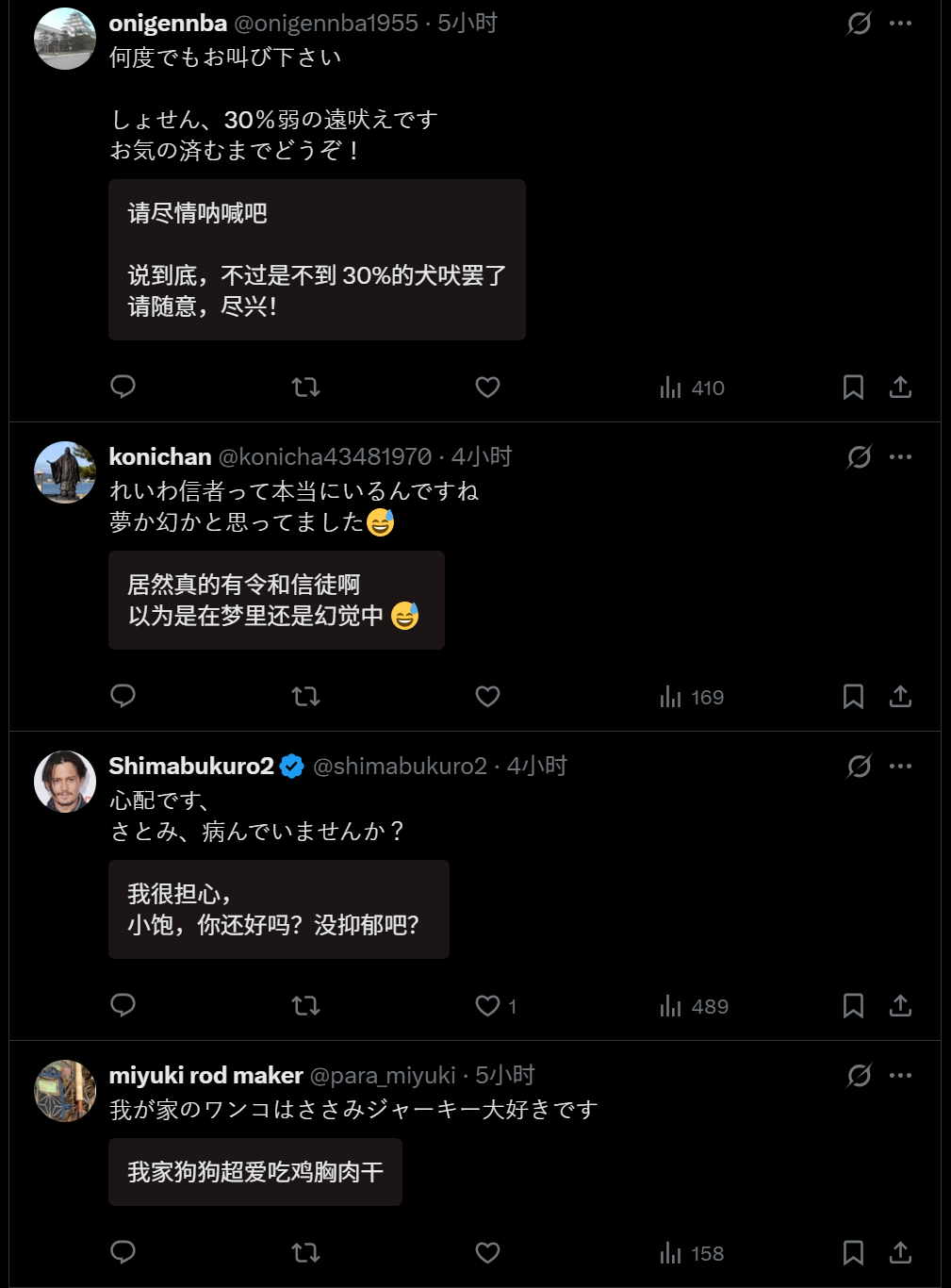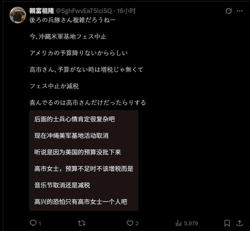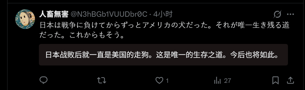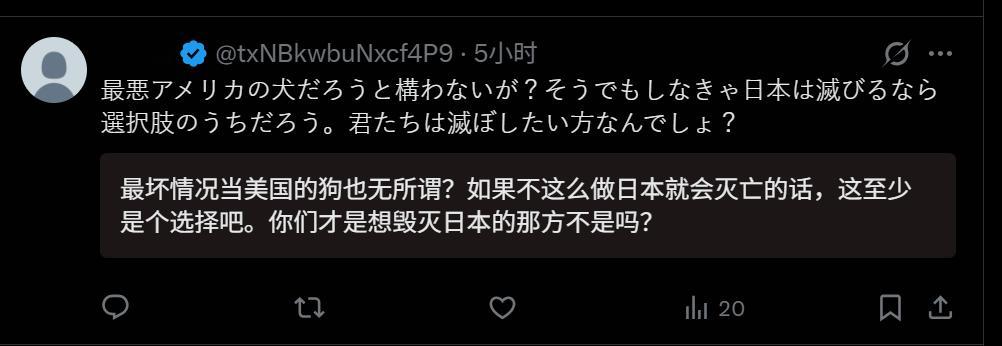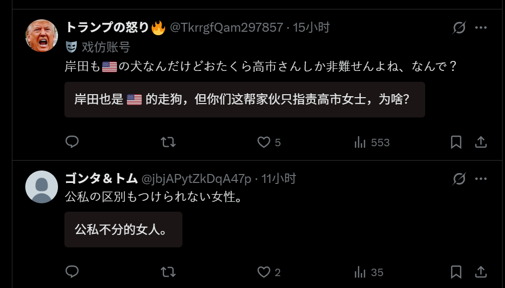 🔻日本网民这几天讨论的议题始终围绕着下面的核心进行:“高市早苗是美国的狗”、“高市不是美国的狗”、“到底谁是谁的狗”、“石破才是狗”、“总比当俄韩的狗好”、“资本家的狗、财务省的狗”、“岸田也是走狗,但你们这帮家伙只指责高市女士,为啥?”、“你们才是狗”、“你是谁的狗”、“我也这么觉得。但作为狗只能认命了”、“我家狗狗超爱吃鸡胸肉干”。