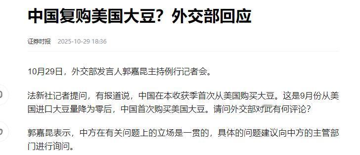 巴西傻眼了!10月29日,中国突然宣布恢复采购美国大豆,双方趋势缓和;巴西豆农之前不断给中国涨价,终于品尝恶果! 过去这些年,巴西一直是咱们主要的大豆供应国,特别是2025年上半年中国停购美国大豆后,巴西大豆占咱们进口的比例一路飙升,9月份的时候更是占到了93%,几乎垄断了中国市场。 就凭着这份垄断地位,巴西豆农的心思活泛起来了,觉得中国离了他们的大豆不行,从10月初就开始疯狂涨价。 1月份的时候每吨才420美元,到10月21日直接涨到了650美元,短短几个月涨了230美元。为了让涨价显得合理,他们还编了一堆理由,说北部下暴雨淹了农田,南部干旱减产,港口排队要45天,运输成本涨了不少,可这些话根本经不起推敲。 巴西自己的官方数据都显示,新季大豆产量能到1.776亿吨,出口量能超1.1亿吨,根本不存在缺货的问题。更过分的是他们还搞价格歧视,卖给欧洲的大豆每吨比卖给中国的便宜20美元,把中国买家当冤大头。 这涨价让中国的油厂苦不堪言,加工一吨巴西大豆就要亏200多块,要是接着买,老百姓吃的食用油都得涨价。 其实9月份巴西刚开始涨价的时候,中国就已经减少了四成采购量,可巴西豆农根本没当回事,以为咱们迟早得回头求着他们买,依旧死咬着高价不放。 直到10月17日,中国大豆产业协会一声令下,近百家粮油企业集体暂停了12月和次年1月的巴西大豆订单,涉及的量足足有800万吨,相当于巴西一个月对华出口量的七成,这时候巴西才慌了神。 他们不知道的是,中国早就做好了后手,根本不是只能靠他们供货。9月份阿根廷取消大豆出口关税的时候,咱们48小时就抢订了130多万吨,每吨比巴西便宜30到40美元,一下子就省了几千万美元。 同时还把乌拉圭、俄罗斯的大豆都拉进了采购清单,9月份从阿根廷买的大豆已经占了当月进口的35%,加拿大的出口也涨了20%。 国内的储备更是充足,现在全国大豆储备有4500万吨,中储粮10月份刚拍卖了4万吨陈豆,11月还会追加投放,油厂的原料库存够撑43天,远远超过35天的安全线,短期根本不愁没大豆用。 咱们自己种的大豆也在发力,黑龙江种了1.42亿亩,年产量能到2300万吨,农户种大豆还有补贴,产量一年比一年高。 就在巴西焦头烂额的时候,10月29日中国直接给了他们致命一击,中粮集团一下子采购了18万吨美国大豆,计划12月到明年1月运过来。 这可是近半年来第一次买美国大豆,虽然量看着不多,只占咱们年进口量的千分之二,但象征意义太大了,明摆着是中美关系缓和的信号,更是告诉巴西,中国的采购渠道多的是。 这事儿其实早有苗头,10月底中美在吉隆坡刚开完经贸磋商,美方承诺取消不合理关税,中方就同意扩大农产品贸易,大豆采购就是咱们释放的善意。 美国大豆本来就有优势,蛋白含量比巴西的高2个百分点,正好适合咱们做饲料,而且运输成本还低15%,之前就是因为关税问题才买得少了。现在关税问题一松动,美国大豆自然就回来了。 这一下巴西彻底没了脾气,帕拉纳瓜港里200万吨大豆堆在船上等着靠岸,每天光滞港费就烧120万美元,之前涨价的底气全没了。最大的粮商邦吉最先扛不住,10月22日就悄悄把报价降了18美元,可根本没人买。 基层的巴西豆农更惨,大豆堆在仓库里卖不出去,新季大豆1月底就要上市,到时候库存直接翻倍,根本没地方放。好多豆农都是贷款种的地,现在贷款到期还不上,利息越滚越多,有人被逼得拉着横幅找政府求助。 可巴西政府也没办法,欧洲和印度加起来一年才买2500万吨大豆,还不够中国一个月的量,根本找不到替代市场。 其实这事儿怨不得别人,都是巴西自己短视。2018年美国涨价的时候,还是中国转头买巴西大豆救了他们,这些年咱们帮他们建化肥厂解决肥料问题,修铁路打通运输通道,还给他们签十年期的大订单,让他们能拿着订单去银行贷款。结果他们刚有点优势就飘了,学着美国搞涨价逼宫,这下好了,把自己逼到了绝路上。 中国早就说了,采购大豆看的是公平合理,谁厚道就跟谁买。巴西要是早明白这个道理,也不会落到今天这个地步。现在新季大豆马上要上市,中美合作又有了新进展,巴西的高价泡沫一戳就破,这恶果说到底都是他们自己种下的。