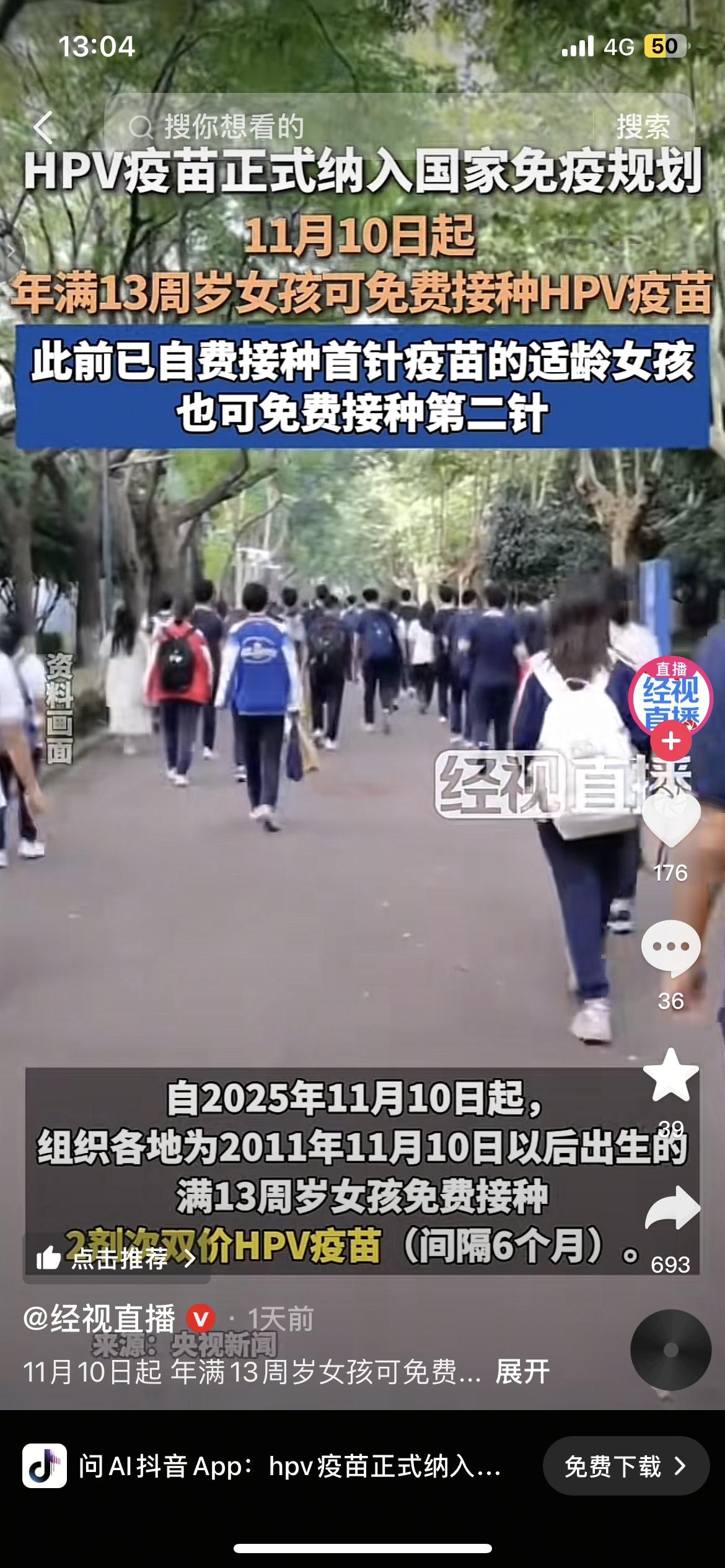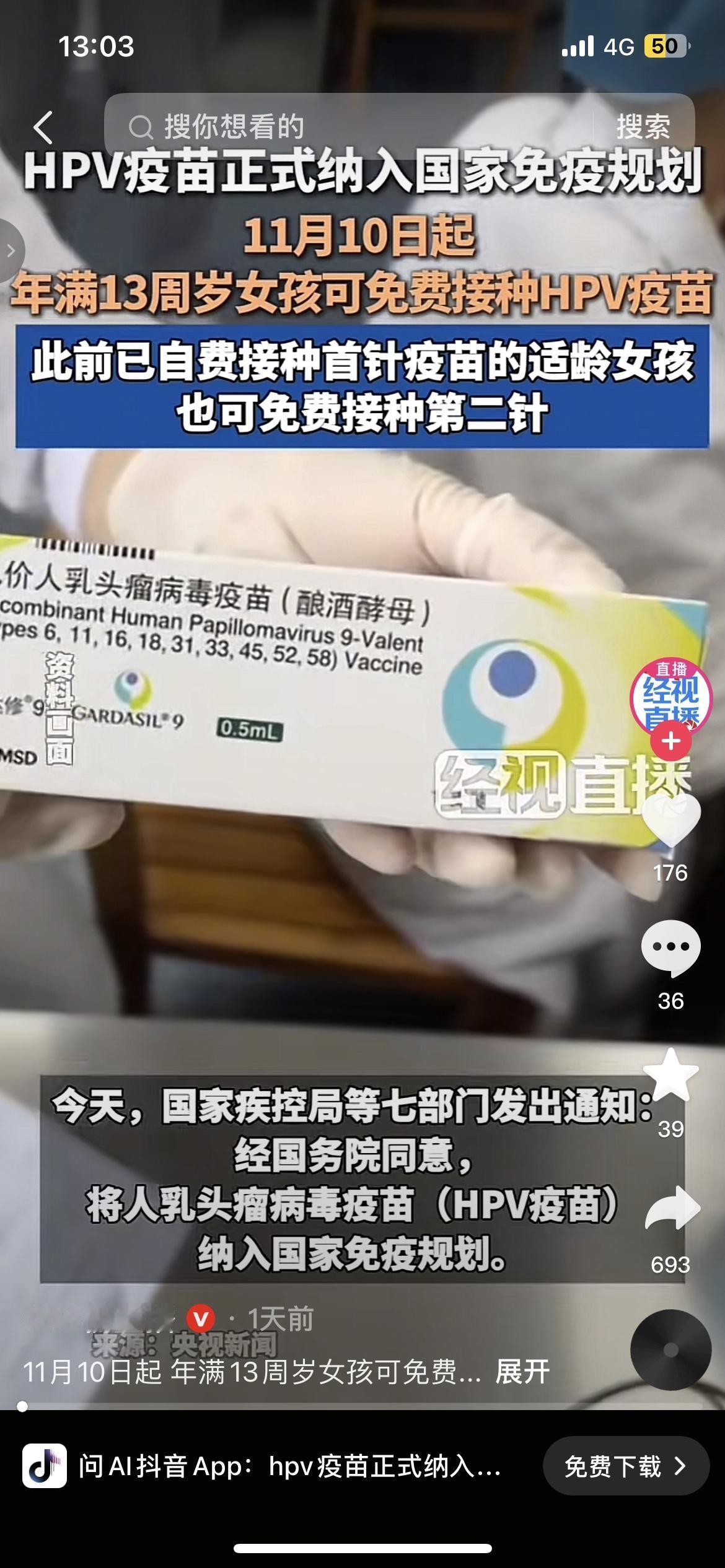 【11月10日起!13岁女孩免费打HPV自费首针也免单】 刚官宣的政策直接戳中家长心窝子——11月10号开始,满13周岁女孩能免费打HPV疫苗了! 关键福利:之前自己花钱打了第一针的,第二针直接免单! 谁懂啊?之前抢苗要蹲点、自费要花小一千,现在国家直接把“防宫颈癌的刚需针”包了! 家里有适龄姑娘的是不是已经乐开花了?这波福利能帮多少家庭省了心? 快转给身边有女孩的家长,这“国家发的健康礼包”可别漏了!国产HPV疫苗 国产HPV疫苗