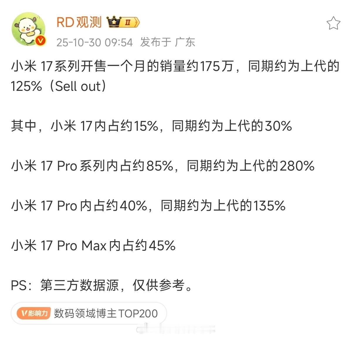 双11开门红小米手机国产第一 首销超百万台、进入平销期的小米17系列,依然能按着一群首发新品打,往200万销量冲刺 ...