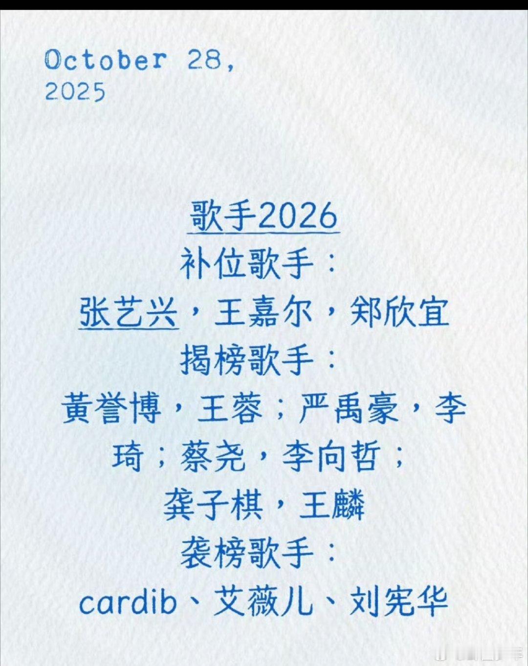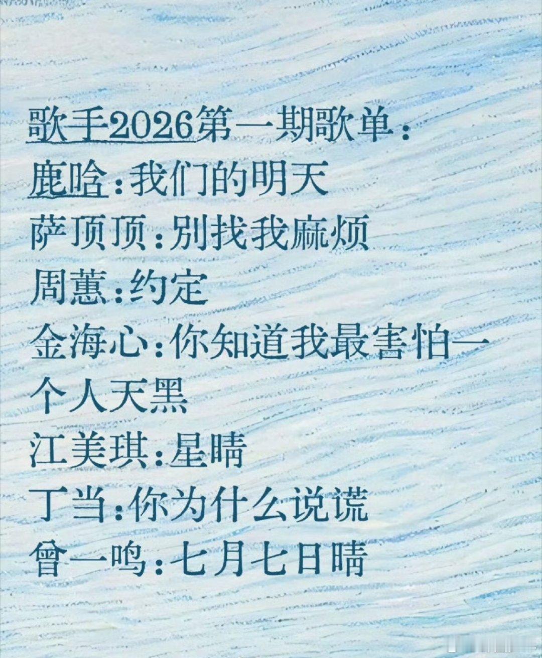 网传歌手2026首发歌手 光是看名单就已经开始期待了!萨顶顶的神秘、鹿晗的帅气、周蕙的治愈、曾一鸣的力量感、丁当的爆发力、金海心的灵动、江美琪的温柔,每一位都让人想立刻点开节目!