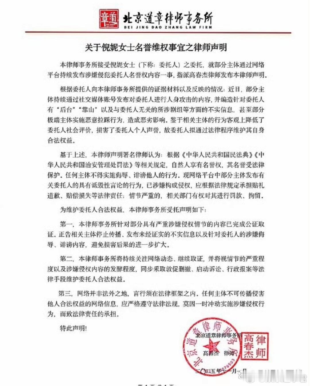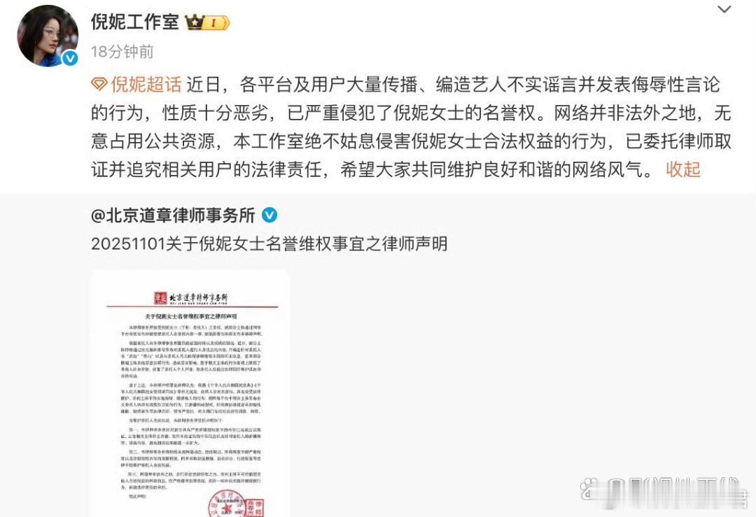 倪妮名誉维权声明11月1日,倪妮工作室委托律师发布声明,称已严重侵犯了倪妮的名誉权,“本工作室绝不姑息侵害倪妮女士合法权益的行为,已委托律师取证并追究相关用户的法律责任,希望大家共同维护良好和谐的网络风气。