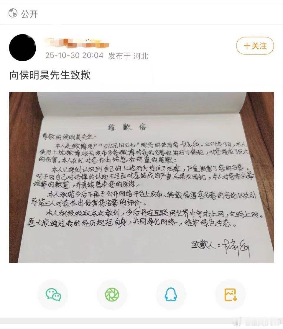 侯明昊告黑胜诉 侯明昊维权首案告捷,大快人心!面对豆瓣、微博等平台的造谣辱骂,工作室果断取证起诉,以法律捍卫尊严。准予致歉者缓期支付赔偿,更见温柔底色。后续案件持续推进,期待清朗网络,也坐等《逍遥》《玉茗茶骨》等新作品霸屏!侯明昊黑粉手写道歉信