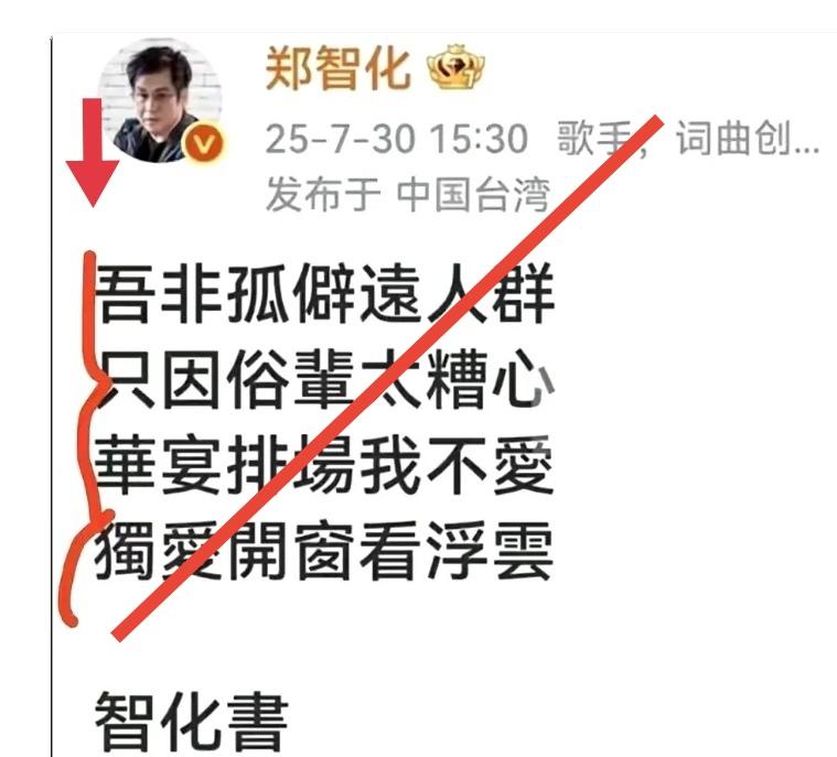 他写的一首诗,才认清了真实的郑智化,这比他在坐飞机后讲的露骨多了。 他来往两地也有年头了,按他说的对相关出行早有不满,为什么早不发声,偏偏在设立了一个新的纪念日后,就整这一出! 藏头诗暴露了真面目,台湾总共就那么点有名气的艺人,国台办以及其他有关部门会有专门的部门监控台湾地区艺人的台独倾向的。一旦确认将彻底断了其在内地谋生空间的。