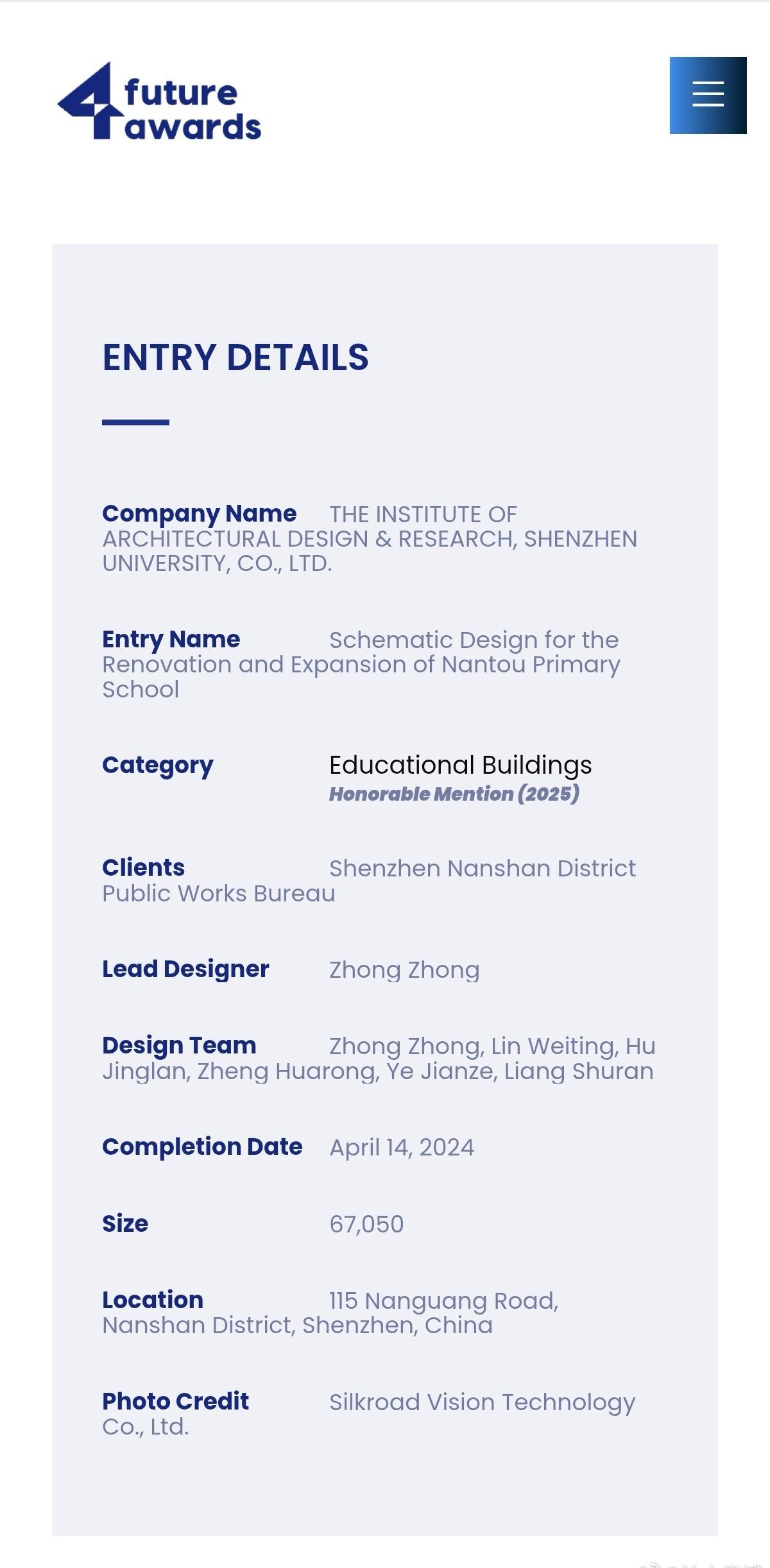 周末收到的小小鼓励我们工作室去年参与的“深圳市南头小学改扩建(竞赛方案)”获得 2025 加拿大 4 Future Awards 教育建筑类别荣誉提名奖 Honorable Mention 🥉 网页链接 感谢深大建筑平台支撑!感谢波涛以及深大设计院各部门支持和各专业配合。祝贺竞赛方案组全体:钟中、林玮珽、胡镜澜、郑华容、叶建泽、梁舒然4 Future Awards深大建筑深圳大学建筑设计研究院有限公司钟中+钟波涛工作室钟中的研究生们建筑设计