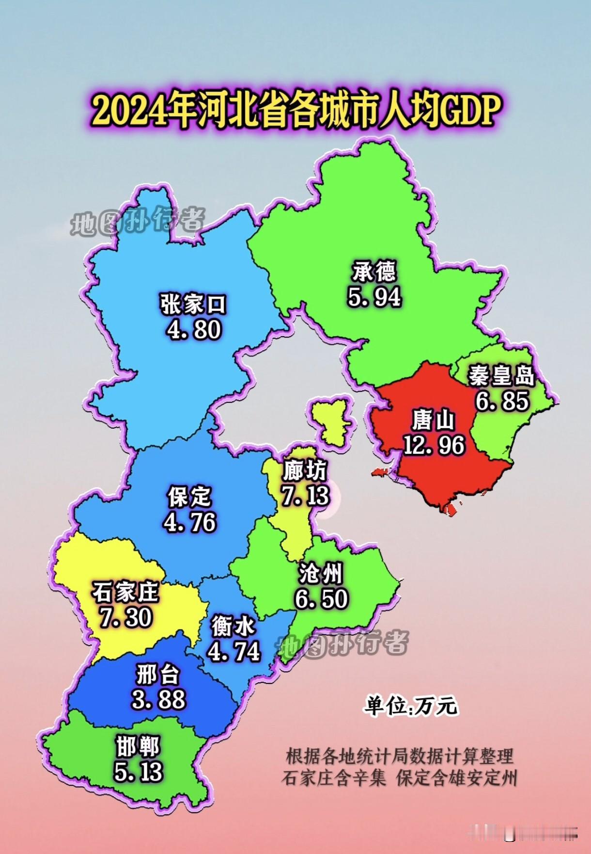 一直以为环京津贫困带是说笑的,实际确实是这样色的啊!2024年北京人均GDP干到了22.8万,天津也有13.2万多,都算是全国靠前的存在。按理说河北平原这么多,人力和矿产资源都不缺,加上京津的高校人才培养,稍微溢出一点都够河北吃饱了,为啥附近的张家口、承德、保定沧州等市发展这么差?尤其是保定,前河北首府,面积2.2万平方公里,人口接近1150万,人均GDP才这么点,不合理啊! 再看看石家庄,才是真正的环石家庄贫困带,邢台人均GDP只有3.88万,只有全国人均的40%,衡水人均GDP也这么低,看来教育这么卷也是有原因的! 羡慕江浙沪,是全体富裕!