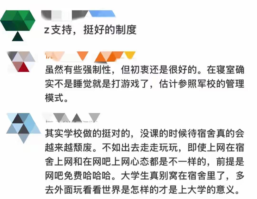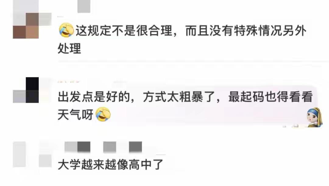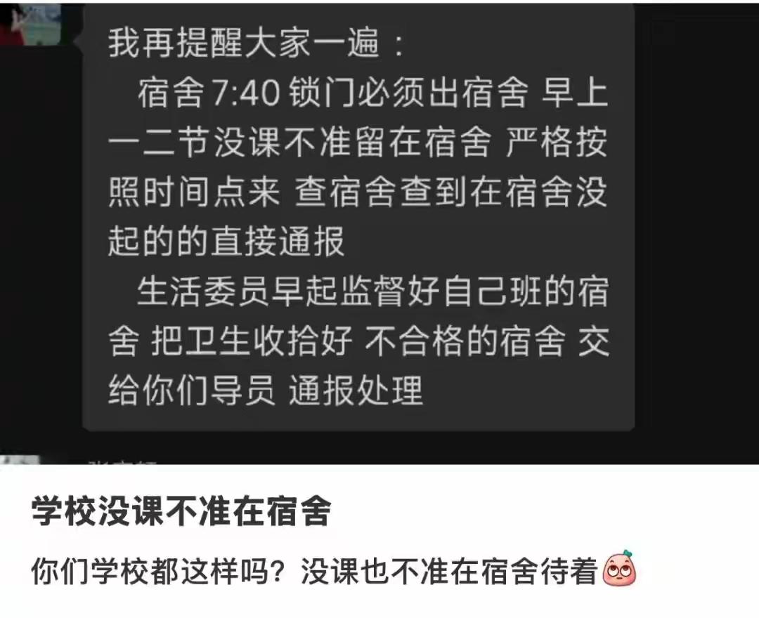 “雨里排队像逃难!”广西一高校发“禁宿铁令”,没课的大一新生8点前被赶出宿舍,连楼门都不让摸,学生撑伞蹲路边刷屏,网友:这是上大学还是进训练营? 据中国青年报10月31日消息,广西理工职业技术学院新规:周一到周五,大一全天“封寝”,没课也得去自习室;大二大三8点前离宿,锻炼40分钟才准回,雨天也不例外。 镜头里,塑料凳排排坐,伞面碰伞面,学生苦笑:“回宿舍拿本书算违纪,我们只能围着楼转圈。”雨越下越大,鞋子灌水,手机没电,有人干脆蹲楼道口,被巡查老师请出。 面对炮轰,学工处硬气回应:规定不会改!新生刚脱离高中,自律差,不锁宿舍他们就躺平;高年级缺乏锻炼,40分钟慢跑正好“治懒”。周末全面放开,平日“苦难”只五天。 家长们却点赞:“严点好,省得孩子在被窝刷手机。”学生反驳:“成年了还像管小学生,外面下雨能去哪?”西安翻译学院曾实行“上午没课禁宿”,被骂上热搜后缩回成命。 眼下,抖音、微博陆续冒出“同款校规”:有的高校把宿舍门禁卡调成“上课模式”,没课刷卡即报警;有的学院派辅导员逐间查人,掀开被子赶人。自主与约束的拉锯战,仍在继续。 对于这件事情,大家有什么看法?