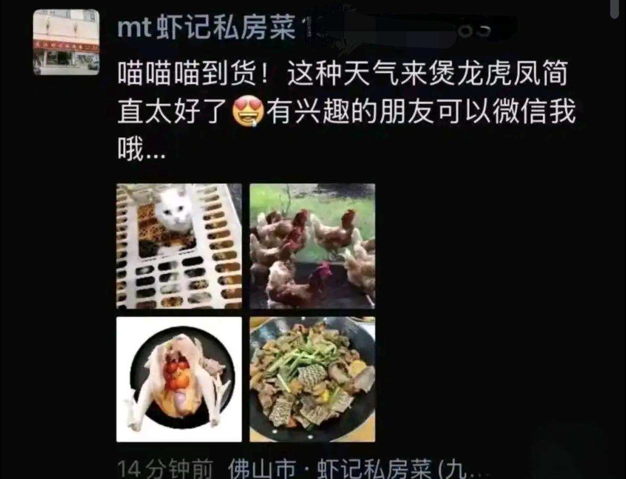 10月30日,有网友爆料广东佛山南海区九江镇“虾记私房菜”存在宰杀活猫,与蛇、鸡一同烹制“龙虎凤”菜品的行为。网友提供的截图显示,店家当日发朋友圈称“喵喵喵到货,这种天气来煲龙虎凤简直太好了”,并附带多只活猫被关笼及一只异瞳白猫置于后厨屠宰台的图片,引发公众广泛关注。 10月31日晚,九江镇宣传部门通报核查进展。当地迅速组织市场监管、公安、卫健等多部门联合核查,对餐厅后厨、冷库及食材储存区域全面排查,未发现猫、蛇等相关食材,同时核查了商家广告及菜单。目前,涉事饭店已被责令停业整顿,后续情况待进一步核实。 执法人员在检查中向经营者及辖区餐饮单位开展食品安全法规宣传,明确禁止食用来源不明的猫、蛇等肉类,要求落实主体责任,严禁售卖国家禁止食材,并将加大后续监管与宣传力度。 网友质疑活猫来源合法性、检疫情况及食品安全隐患,志愿者复查时后厨已无活猫,店家称仅养有犬只,推测猫已被宰杀。涉事商家虽回应称是“帮朋友加工家养猫”,但未平息质疑,目前美食平台显示其已停止营业。 不食用猫狗等伴侣动物,既是对生命的敬畏与温情,也是守护公共卫生安全的责任担当,更是现代文明社会的基本底线。