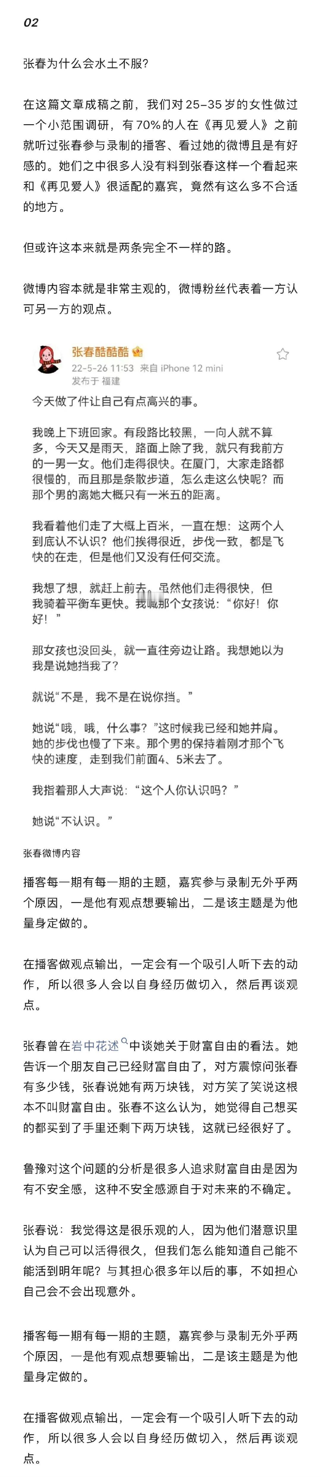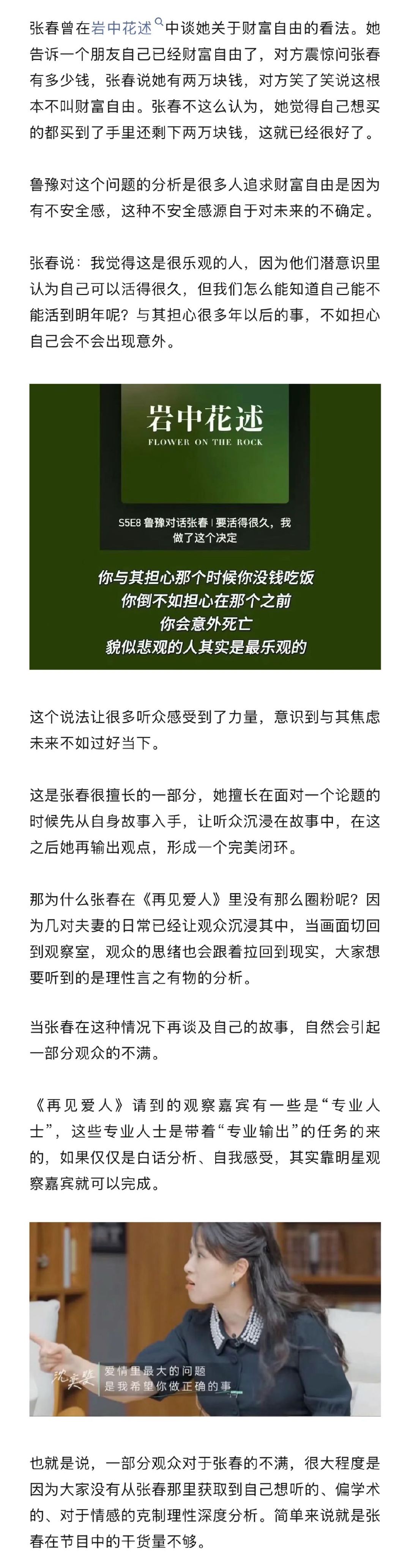什么样的观察嘉宾适合再见爱人为什么张春在再见爱人水土不服 张春在播客界有很好的口碑,但当她成为《再见爱人5》的观察嘉宾明显出现了水土不服的情况。作为一个围绕感情深水区展开的节目,可能没有哪位观察嘉宾是绝对符合的,只有观察嘉宾身上的某一点特质和节目相匹配才能有最优解。