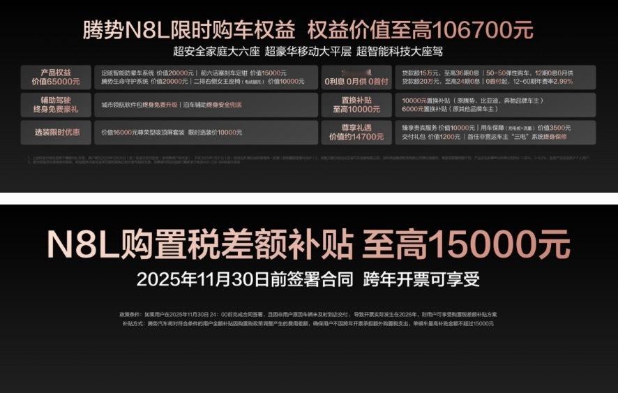 一台家人全票通过的车 10月28日,腾势N8L正式上市,推出2款车型,指导价29.98万-32.98万元,限时购车权益至高10.67万元,含三年免息、置换补贴及购置税差额补贴。该车定位“大六座安全豪华SUV”,以“越级价值终极满足”为核心,全系标配六大核心科技,诠释家用车豪华感、安全感与科技感,打造“五心体验 三感相伴”的家庭出行体验。