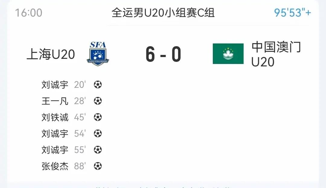 刘诚宇1人独进3球,上演帽子戏法,打过国足、亚冠和中超的比赛就是不一样,刘诚宇在U20全运会大开杀戒,简直是降维打击啊!上海U20队6比0大胜中国澳门U20,刘诚宇和上海海港双子星:蒯纪闻和李新翔组成三叉戟一起出战,刘诚宇25分钟内就上演帽子戏法,看样子,踢上高质量比赛就是不一样,刘诚宇这一年进步还是挺快的,未来潜力无限!
