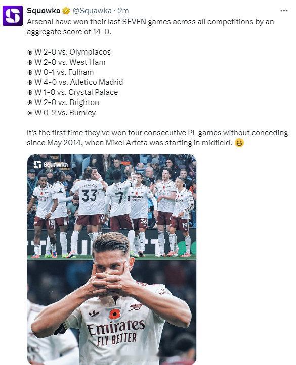 阿森纳在各项赛事中已取得七连胜,总比分14-0!