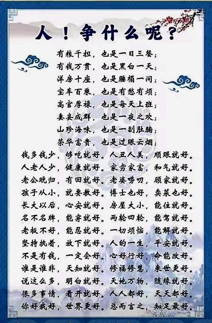 人生短短几十年 争名夺利为哪般 金银财宝带不走 死后哪样握手中 活着就要看开些 别想过往得与失 不与小人争道理 莫和家人争脾气 争来夺去一场空 繁华落尽是清风 看淡是非和荣辱 心宽自有大天空