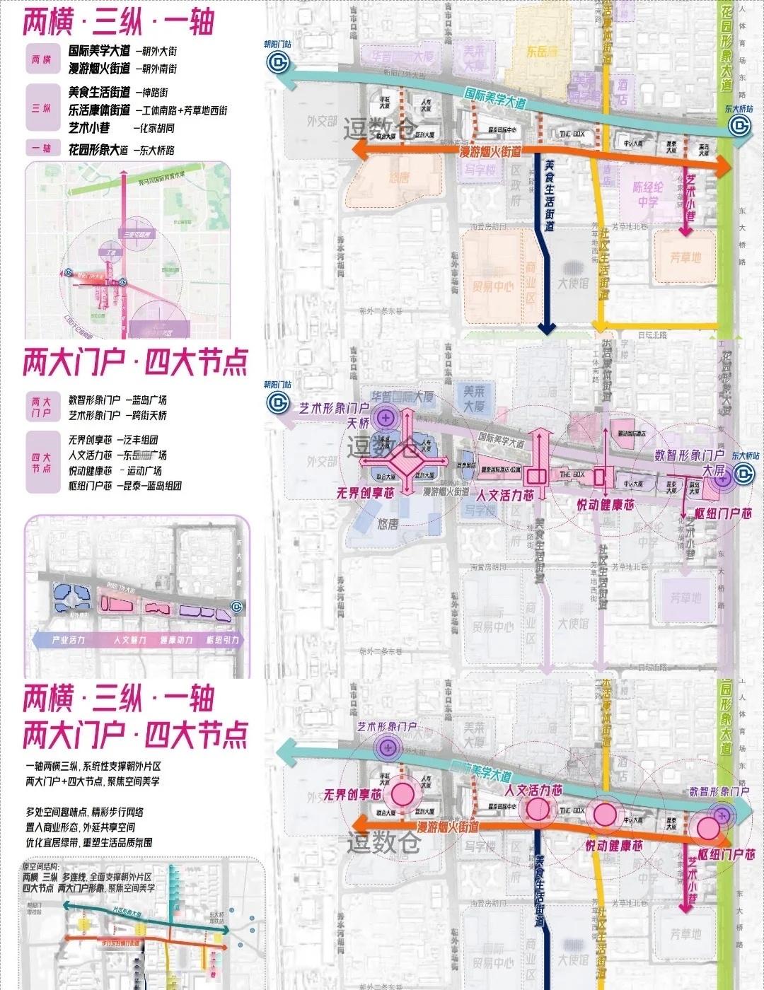 城市片区商业街区整体更新改造规划设计 💫愿景使命 👉朝阳而生,美虞物外 兼具国际视野+创新美学+人文情怀复合之美的中心城焕新区 💫商业维度 ✅以全时段人气为目标 打造文商旅体融合消费新地标 💫产业维度 ✅以全生态服务为载体 构建开放性创新活力枢纽 💫城市维度 ✅以全周期运营为导向 探索公共空间引领城市更新示范 💫空间结构 ✅两横·三纵·一轴 ✨两横 ⏩️国际美学大道-朝外大街 ⏩️漫游烟火街道-朝外南街 ✨三纵 ⏩️美食生活街道-神路街 ⏩️乐活康体街道-工体南路+芳草地西街 ⏩️艺术小巷-化家胡同 ✨一轴 ⏩️花园形象大道-东大桥路 街道景观更新设计 城市设计 规划设计 城市更新 城市更新改造 片区更新 街区更新 文旅新地标 文商旅