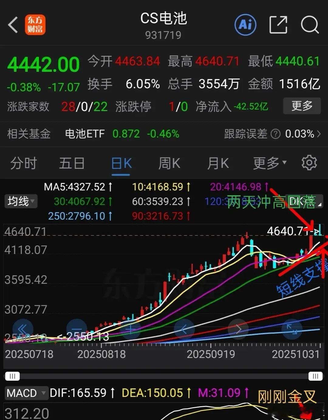 2,中证电池,日线走势如下图2所示,近期表现比较强势,本周4-5由于大盘不配合,连续两天冲高回落,留下上影线,说明主力资金在做高抛低吸,短线有回调需求,先看5日线支撑力度,大约有2.6%,最多回踩下方10日线支撑大约6%。新能源电池长期看好,可分期逢跌低吸。本人本周已经做了止盈减仓,下周择机接回。只要5周线不破可继续持仓待涨。