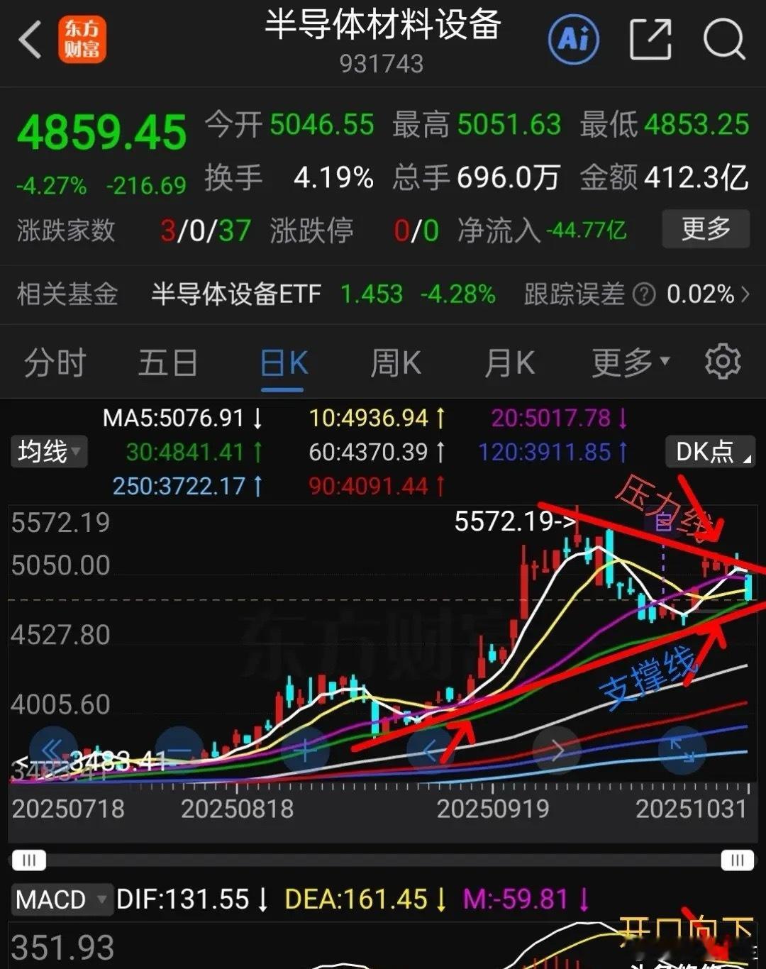 3,半导体材料设备,日线走势如下图3所示,中证半导体材料设备周五大跌超4%,正好处在 30日线上方,也没有跌破上升趋势线。不好的是macd快慢线开口向下,30-60分钟macd没有回调到位,下周初有可能继续回调,希望能在10月23日低点止跌。不好的是下方有个缺口距离目前大约有2%,缺口引力不小。下周前半周大概率继续回调,后半周有可能回升。
