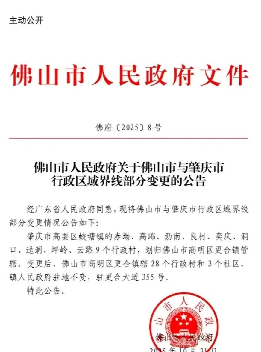 尘埃落定 一切尽在红头文件中了,肇庆高要蛟塘镇九条村划入佛山高明更合镇,目前的疑点就是九村位置比较靠西边,难道是?尘埃终须落定 佛山新机场 广州新机场 佛山 蛟塘镇