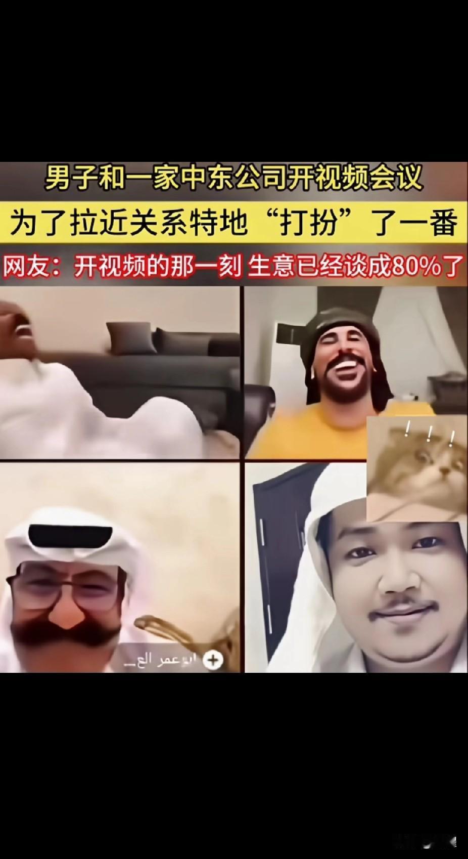 为了谈中东生意, 也是拼了 男子视频会议时直接cos起了中东传统装扮,头巾一裹,小胡子一贴,这架势仿佛下一秒就要掏出石油合同签单。 入乡随俗是让他玩明白了。 对面中东客户们看到这操作,直接笑到拍大腿,会议还没正式开始,那笑声隔着屏幕都快把房顶掀了。 有网友说:这刚开视频,生意就成了八成! 其实跟人打交道,有时候放轻松下了,说不定就把距离拉近了。 这哥们儿,虽然打扮得有点夸张。 但这份用心和幽默,一下子就让双方没了隔阂。 做生意,处朋友,偶尔来点小幽默、小真诚,事儿说不定就成了。 友友们赞同吗? 中东装束 中东妆容 假装中东人 伊朗中东角色 中东发型 生意 搞笑