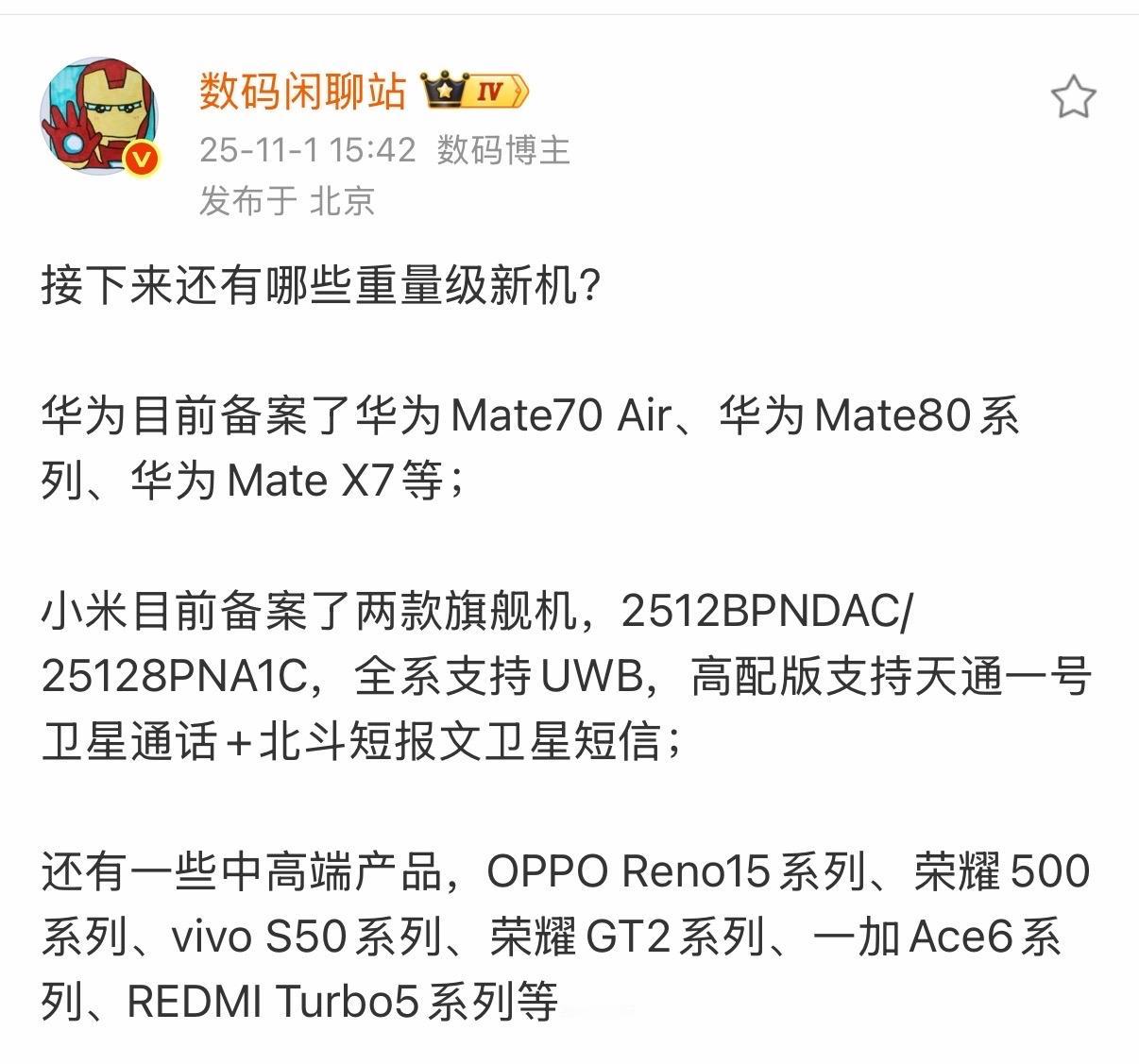 待发新机型: 华为Mate70 Air、华为Mate80系列、华为Mate X7; 型号小米2512BPNDAC和25128PNA1C,高配版支持天通一号卫星通话+北斗短报文卫星短信,应该是小米17 Ultra; OPPO Reno15系列、荣耀500系列、vivo S50系列、荣耀GT2系列、一加Ace6系列、REDMI Turbo5系列; 买不完根本买不完[允悲]你期待哪一款?