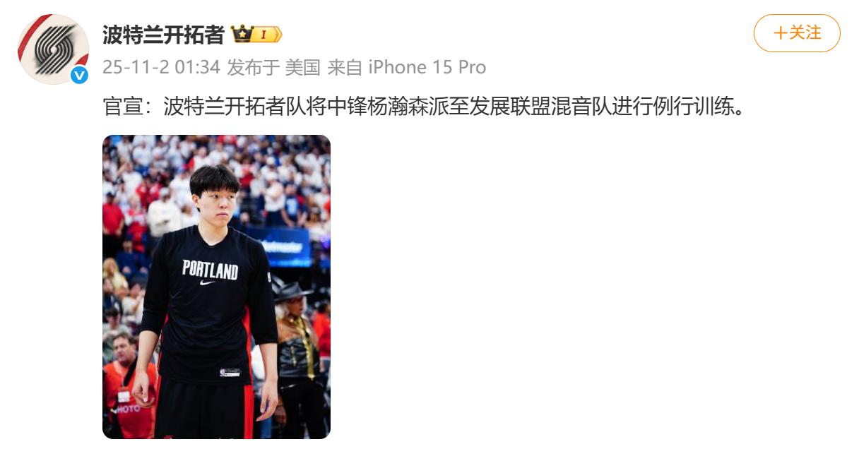 杨瀚森被“下放”!昨日,NBA开拓者队官宣,球队今年引进的20岁中国球员杨瀚森将去往球队的发展联盟下属球队撕裂之城混音进行“既定好的部分训练(for scheduled practices)”,球队表示,此举是为了让杨瀚森收获更多的训练时间,周一,他还将回到球队参加与湖人队的比赛。杨瀚森加盟开拓者队后,已经随队经历了新赛季的六场比赛,前五场虽都有登场,但场均仅出战5.8分钟,得到1.8分、0.8篮板、0.4盖帽,助攻和抢断都是零,还有0.6次失误和0.8次犯规,投篮命中率22.2%,而昨天的第六轮对阵掘金的比赛,杨瀚森第一次全场坐“冷板凳”,没有获得出场机会,也是球队大名单中唯一没有上场的球员。