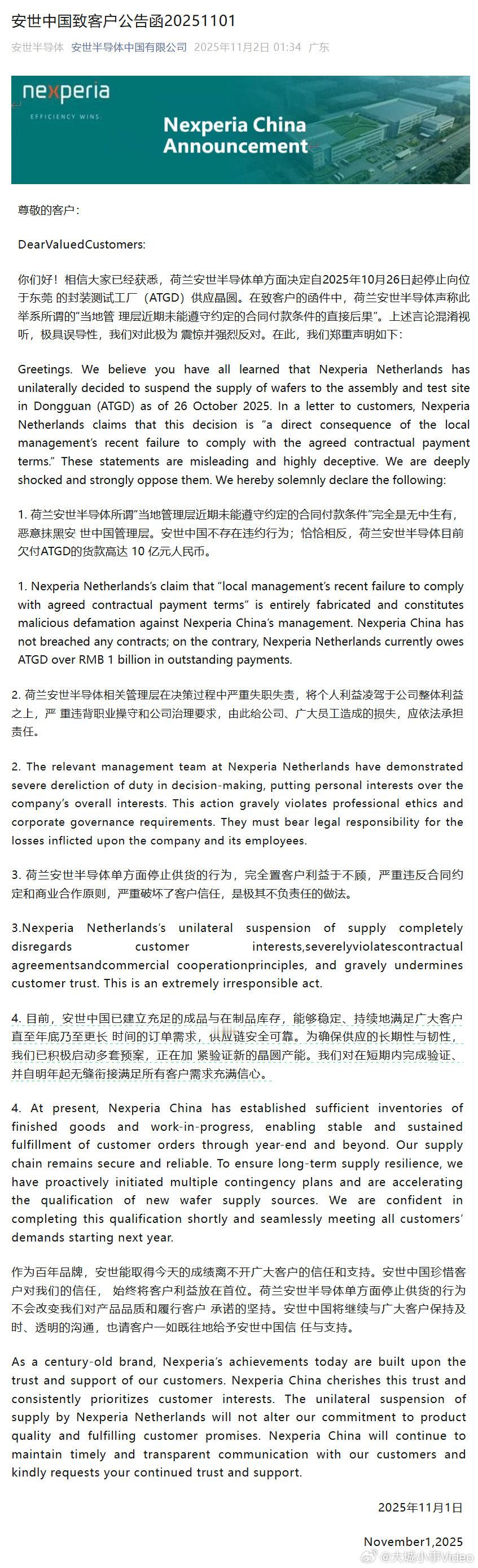 【安世半导体最新发声】11月2日,安世中国发布致客户公告函称,荷兰安世半导体单方面决定自2025年10月26日起停止向位于东莞的封装测试工厂(ATGD)供应晶圆。